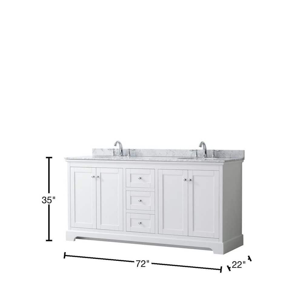The Wyndham Collection Avery 72" Bathroom Vanity combines timeless design with modern functionality. Featuring a white Carrara marble top and a durable plywood cabinet, it offers ample storage with its double sinks, drawers, and doors. Perfect for enhancing any bathroom space.