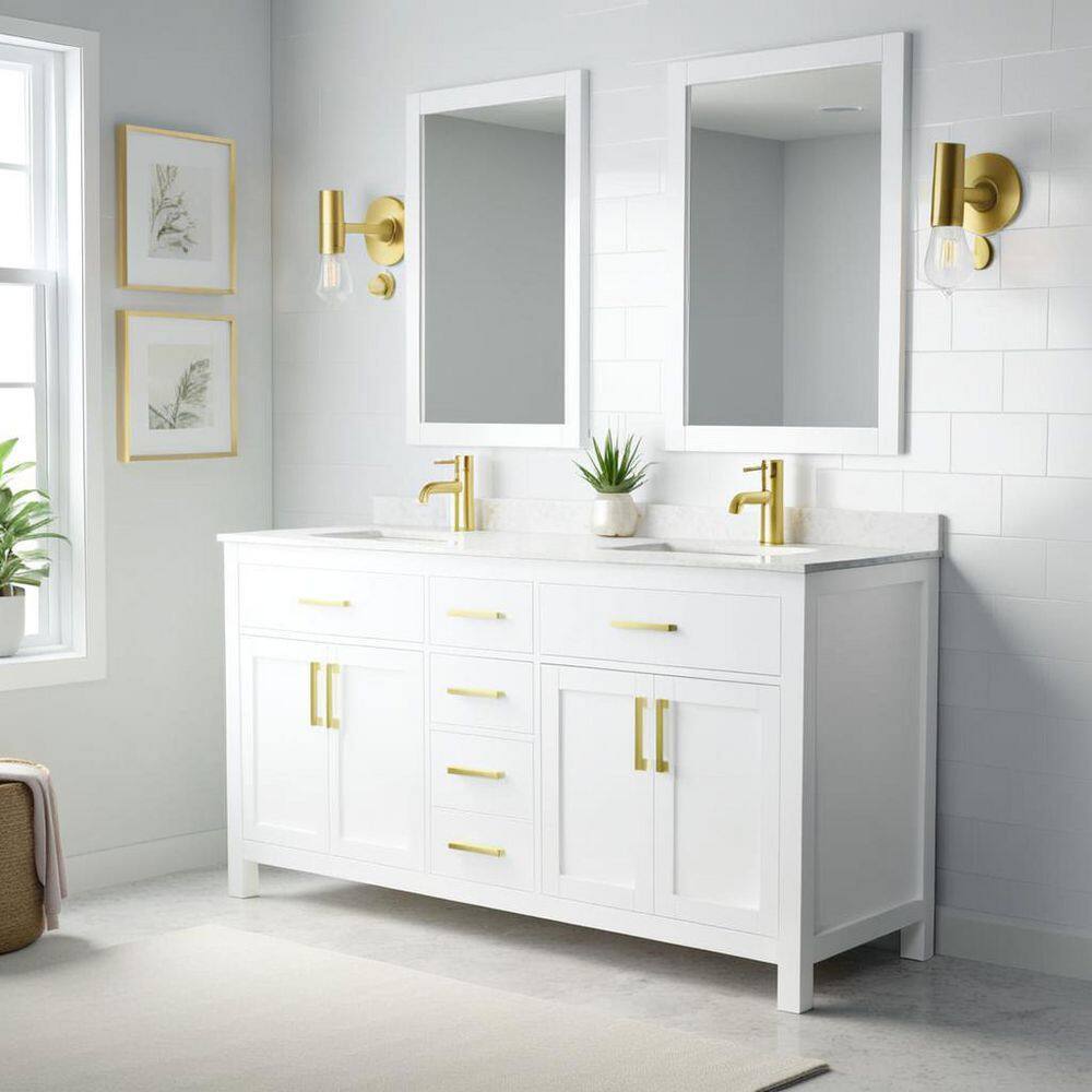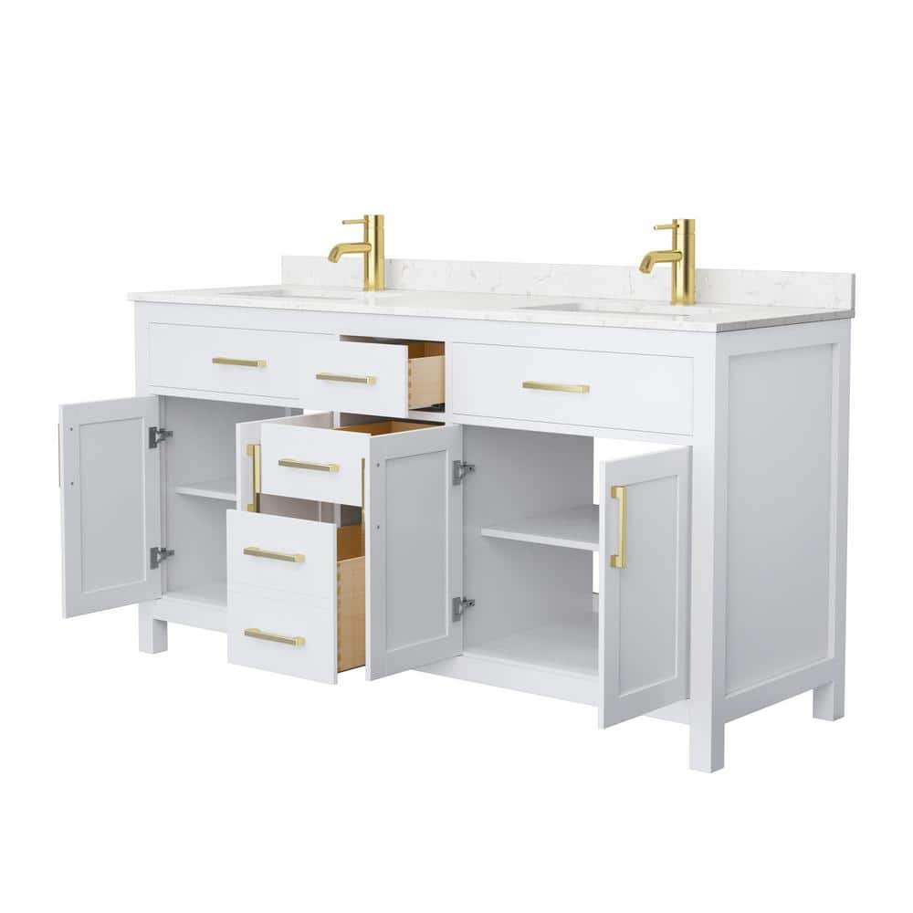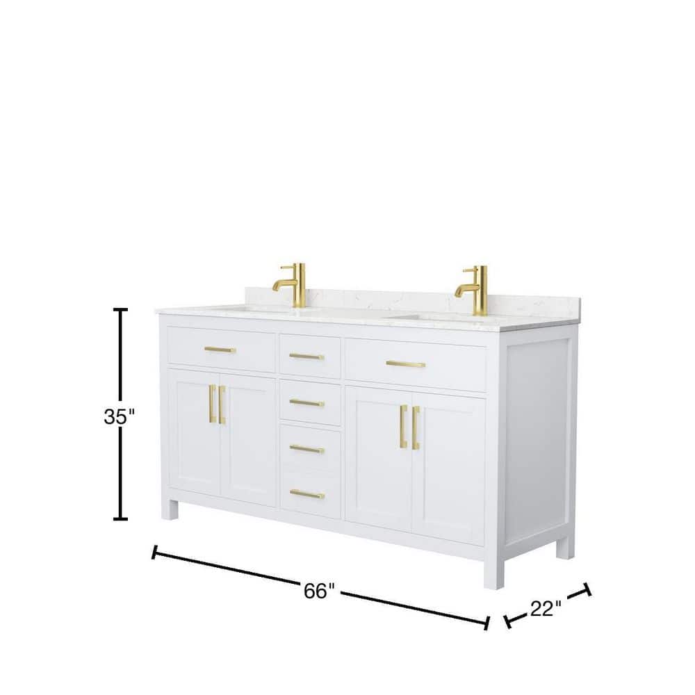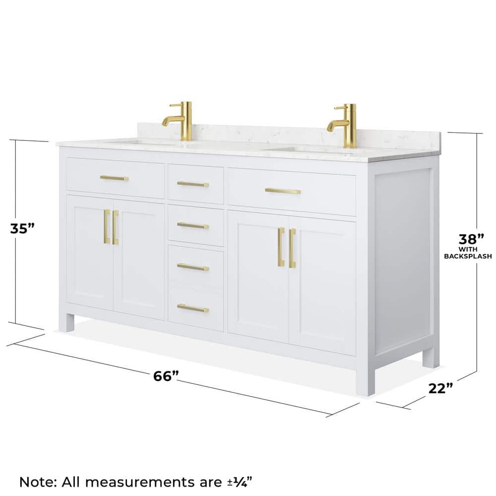 The Beckett 66" Double Bath Vanity is a masterpiece of design and functionality. Its cultured marble countertop and brushed gold hardware create a luxurious aesthetic, while the ample storage and soft-close features ensure practicality. Pair it with a statement mirror and elegant lighting to craft a bathroom that exudes sophistication and comfort. This vanity is the perfect blend of style and utility, making it a must-have for any refined space.