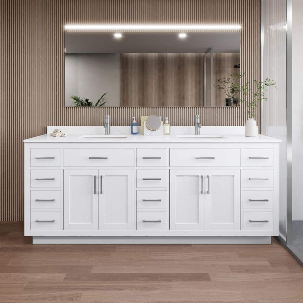 Customers praise the Beckett TK 84" Double Sink Bath Vanity for its elegant design and high-quality construction. Many highlight the ample storage space and the soft-close drawers as standout features. Some customers noted that the assembly process requires careful attention, but the end result is worth the effort. Overall, it is highly recommended for those seeking a stylish and functional bathroom upgrade.