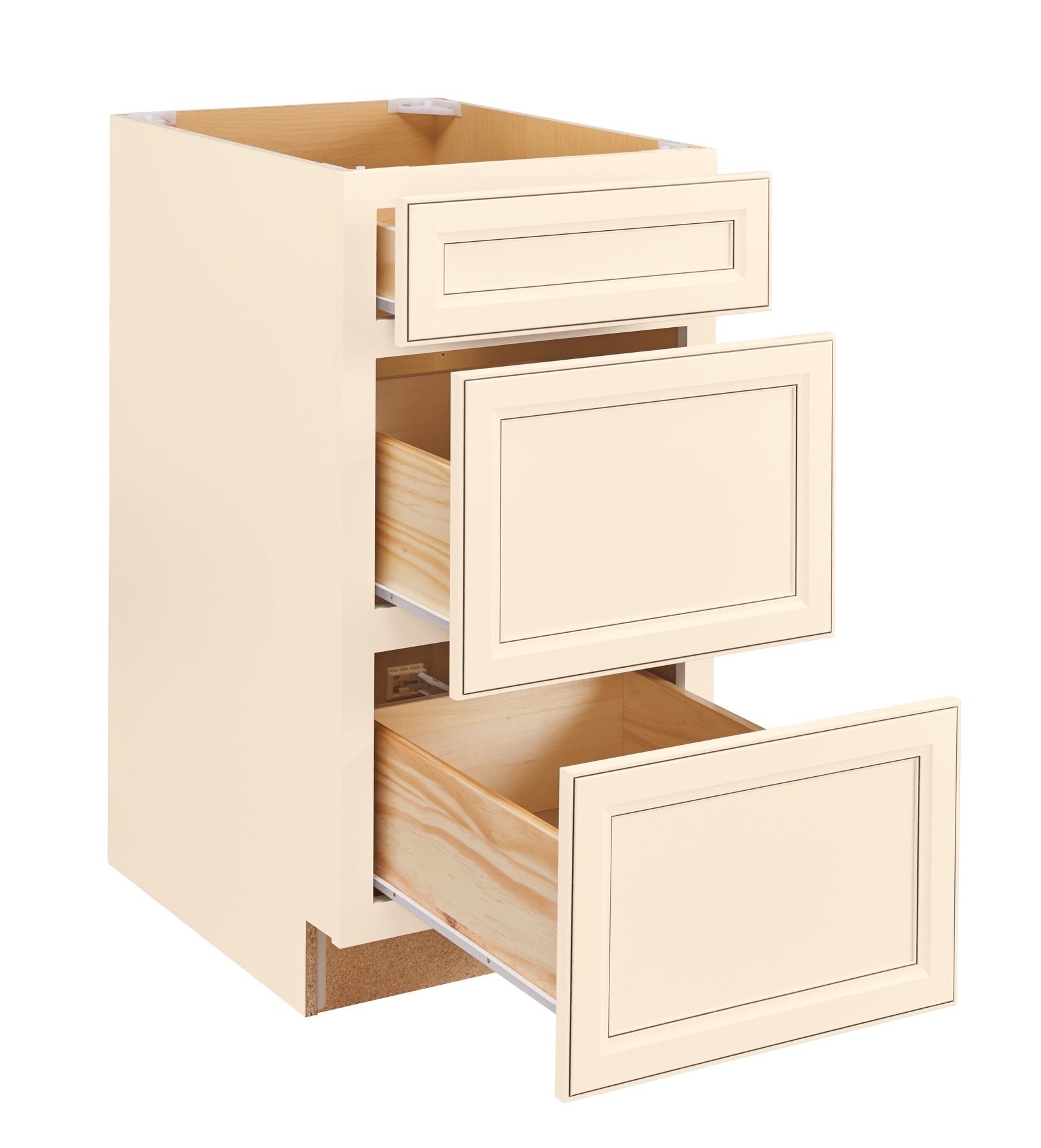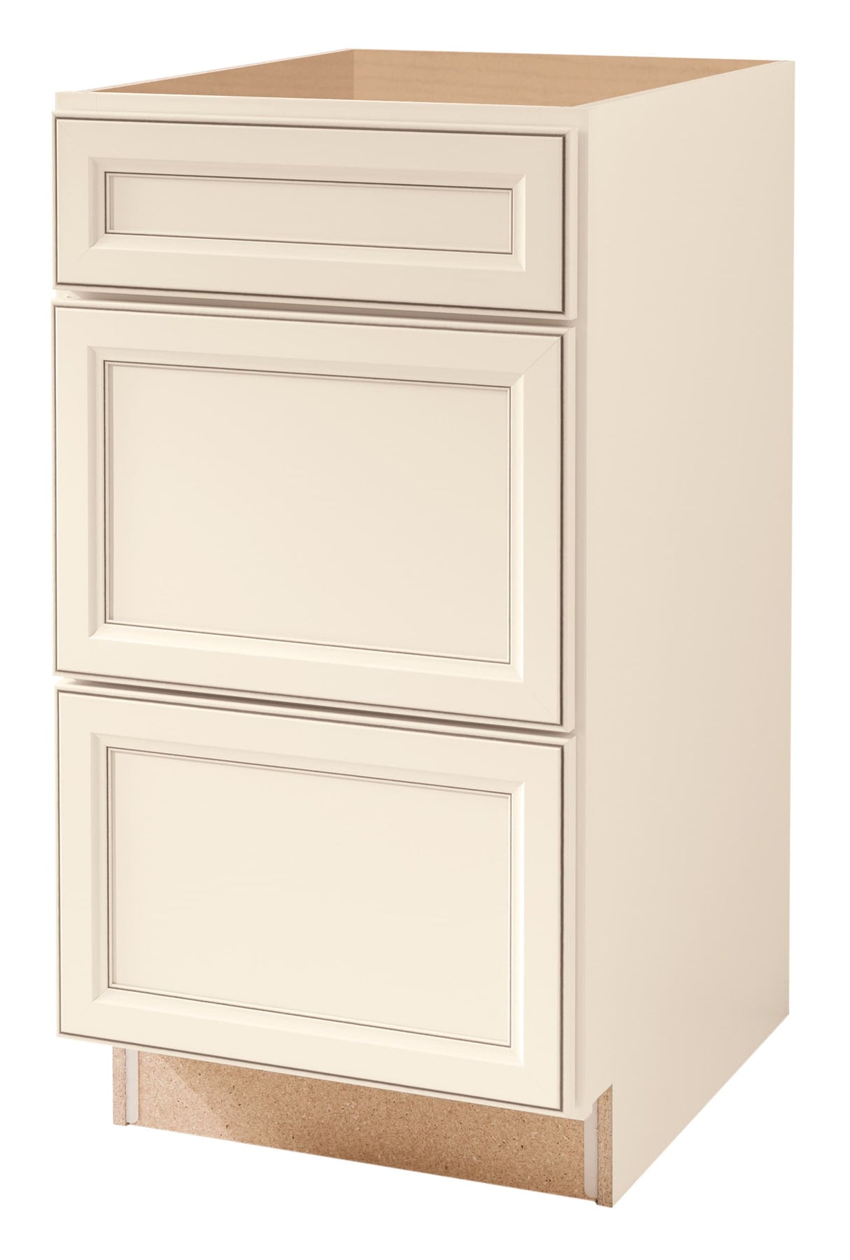 Fully assembled Diamond NOW Caspian drawer base cabinet delivers durable, easy-clean TrueColor laminate in a toasted antique off-white. Three recessed-panel drawers provide organized storage, while engineered wood construction with solid backs and sides ensures long-lasting stability.