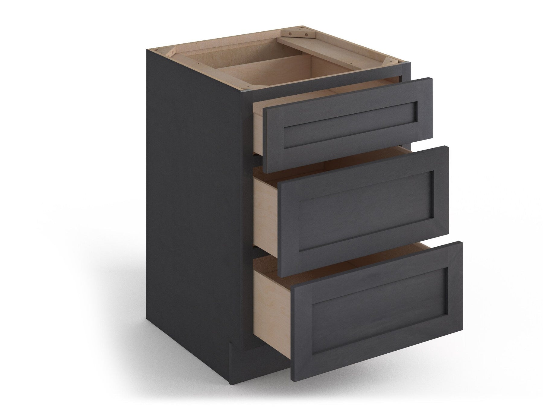 The Valleywood Ideal Gray Birch 3-Drawer Base Cabinet offers the perfect balance of style and durability, made with solid wood fronts and a sturdy plywood box construction. Ideal for kitchens or workspaces, its elegant stained gray finish and soft-close drawers bring a touch of sophistication to any setting.
