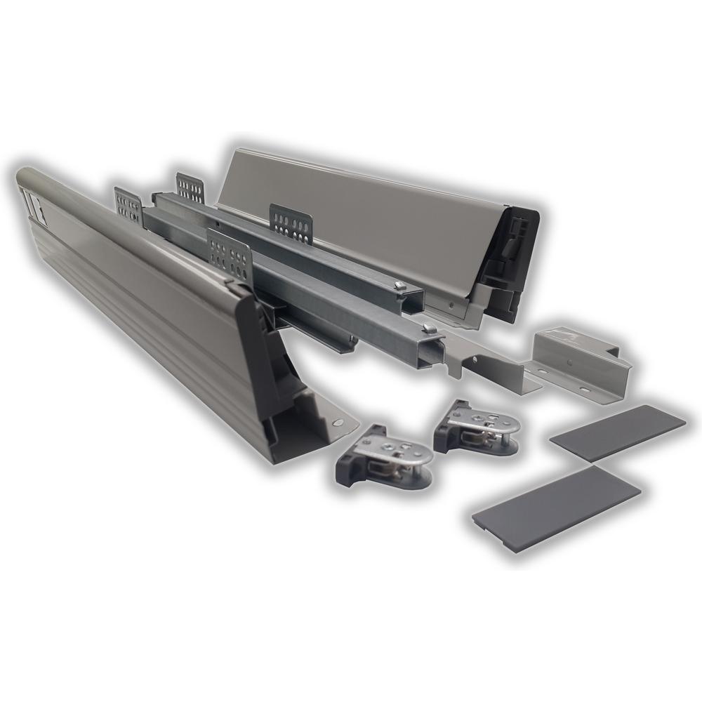Our Tandem box contain totally: 2 extra strong full extension side runners, with soft-close features. 2 steel drawer sides with cover caps. 2 back brackets or a backplate depending on the bin mode. 2 front fixing brackets.