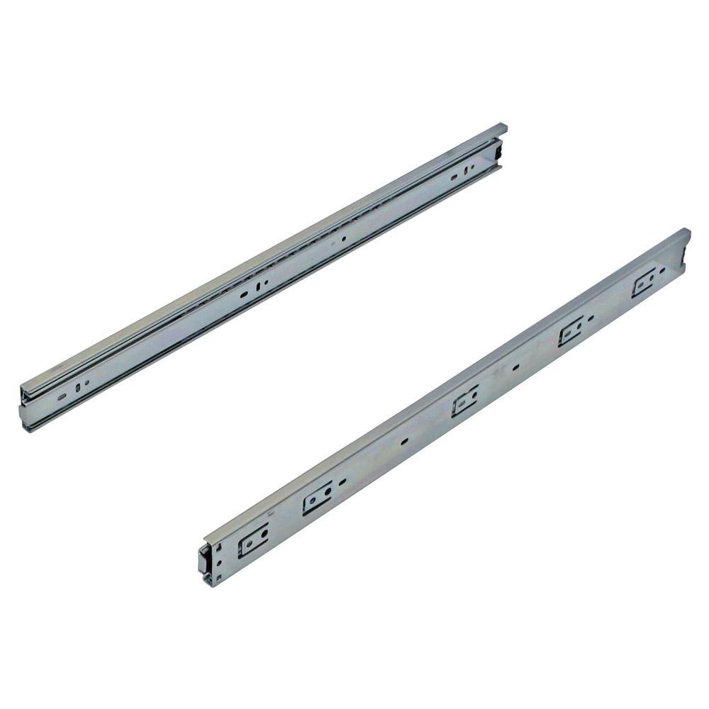 The 1180 Drawer Slide Series has a bright zinc finish and a ball bearing design that operates smoothly and is sturdy enough to support up to 130 lbs. The drawer is full extension and even features over-travel, meaning that the drawer can extend past the front of the cabinet (great for drawers under counter tops). It also has a lever disconnect for easy removal.