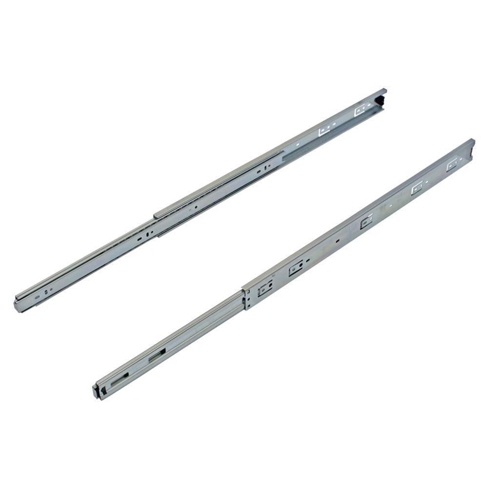 The 1180 Drawer Slide Series has a bright zinc finish and a ball bearing design that operates smoothly and is sturdy enough to support up to 130 lbs. The drawer is full extension and even features over-travel, meaning that the drawer can extend past the front of the cabinet (great for drawers under counter tops). It also has a lever disconnect for easy removal.