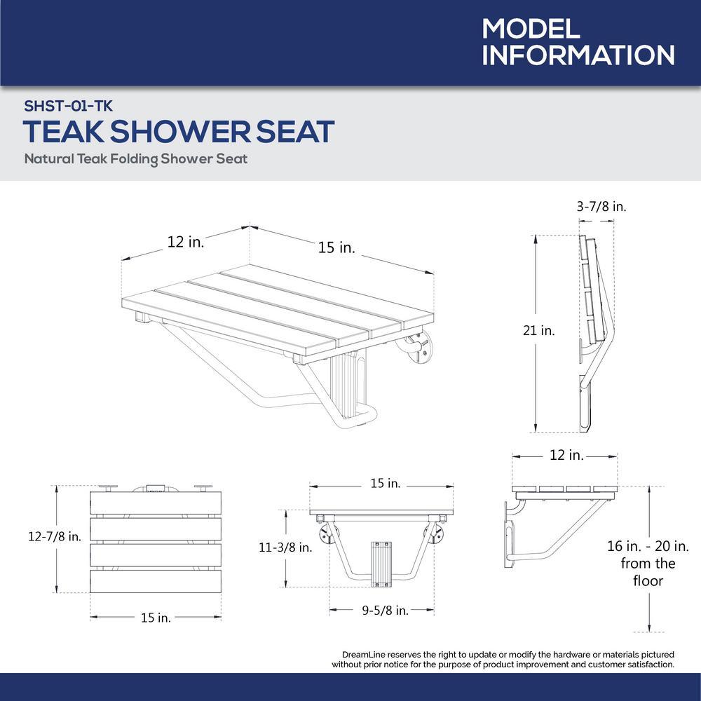 DreamLine 12-7/8 in. x 15 in. Natural Teak Wood Folding Shower Seat, Chrome Hardware