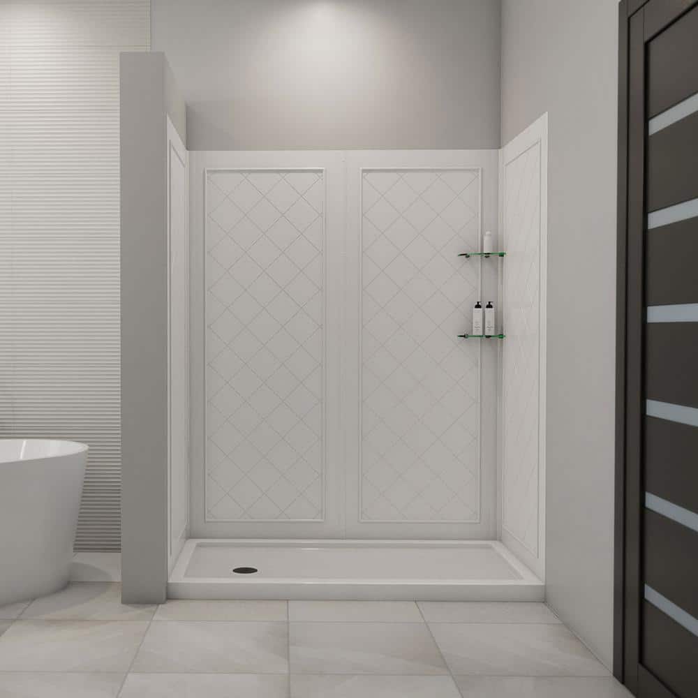 This kit brings a tailored, modern presence to the bath, with crisp lines and a luminous white finish that feels fresh and serene. The diamond-patterned panels add subtle texture, while the low-profile base creates a graceful, barrier-light entry. Style with matte black or brushed brass drain accents and minimalist glass shelving for a polished, spa-like vignette. It’s an essential upgrade that elevates daily living with refined ease.
