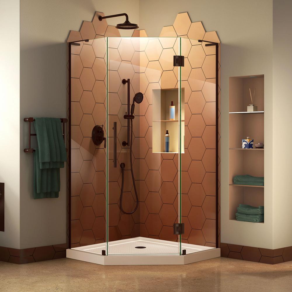 A contemporary neo-angle shower enclosure kit featuring premium 3/8 in. tempered glass and minimalist hardware in Brushed Nickel. Includes the SlimLine white base with low-profile threshold and slip-resistant surface for safe, comfortable entry.