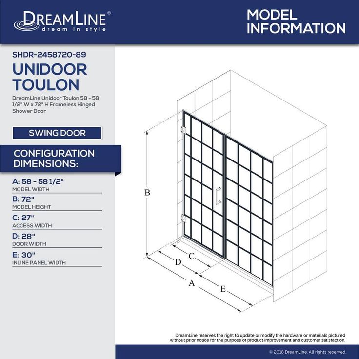 A: Model size is 58–58 1/2 in. W x 72 in. H with an approximate 27 in. walk-in opening.