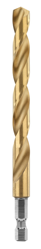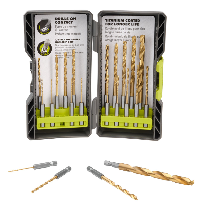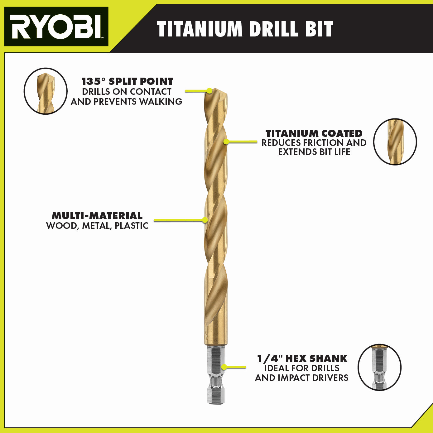 This 22-piece RYOBI titanium drill bit kit features a durable titanium coating to reduce friction and extend bit life. A 135° split point drills on contact to prevent walking, and the 1/4-inch hex shanks provide a secure, non-slip grip for use in drills and impact drivers across wood, metal, and plastic.