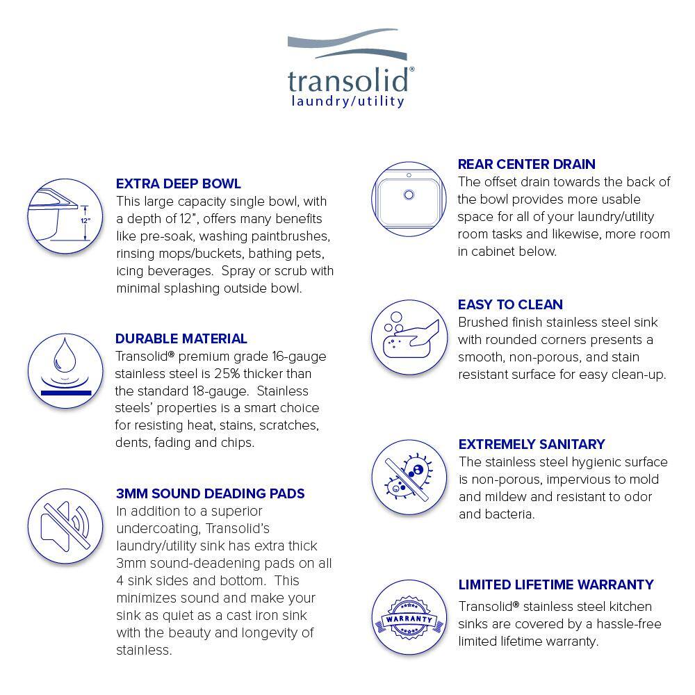 The Transolid Meridian Drop-In Utility Sink offers premium durability with its 16-gauge stainless steel construction. Featuring a deep 12-inch bowl, it effortlessly handles various tasks, from soaking laundry to rinsing paintbrushes. Its sound-dampening technology ensures a quieter experience, while the brushed finish adds a stylish touch to any setting.