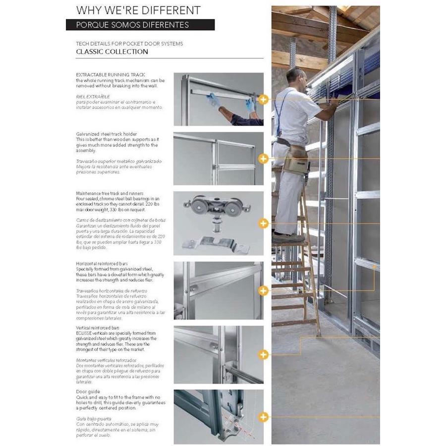 Eclisse 24-in. x 84-in. steel single pocket door frame kit Patented technology makes installation and removal easy; features a removable track so you never have to break drywall again to remove the track Use any door you would like: you're not limited to a specific door design; 1-3/8-in, 1-3/4-in wood, 1-in aluminum or 3/8-in Frameless glass Frame kit includes: galvanized steel frame (assembly required), patented removable track, floor guide, maintenance free track and runners, two adjustable door stops, door mounting kit, all required assembly screws and drywall screws Holds a door up to 220 pounds Frames: the most quality pocket door system on the market; frames are all galvanized steel and no longer use wood components Easy installation and maintenance