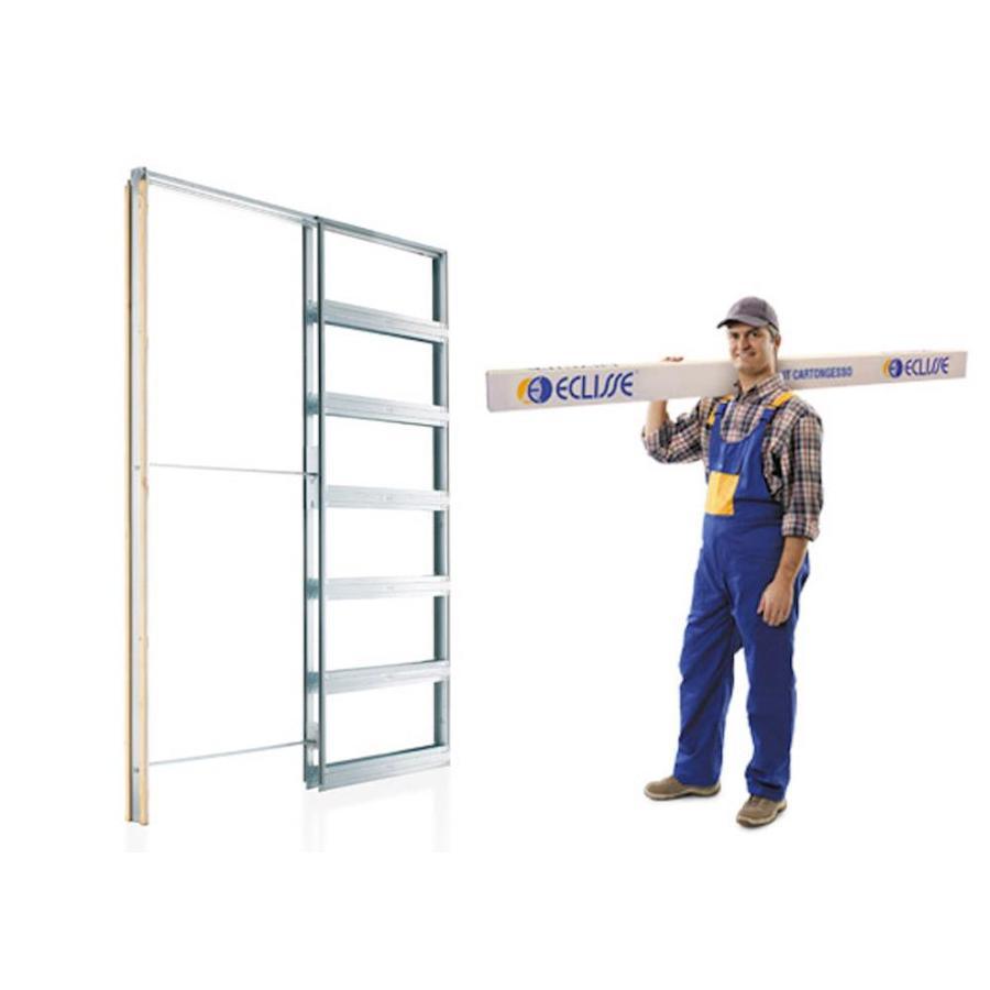 Eclisse 32-in. x 84-in. steel single pocket door frame kit Patented technology makes installation and removal easy; features a removable track so you never have to break drywall again to remove the track Use any door you would like: you're not limited to a specific door design; 1-3/8-in, 1-3/4-in wood, 1-in aluminum or 3/8-in Frameless glass Frame kit includes: galvanized steel frame (assembly required), patented removable track, floor guide, maintenance free track and runners, two adjustable door stops, door mounting kit, all required assembly screws and drywall screws Holds a door up to 220 pounds Frames: the most quality pocket door system on the market; frames are all galvanized steel and no longer use wood components Easy installation and maintenance