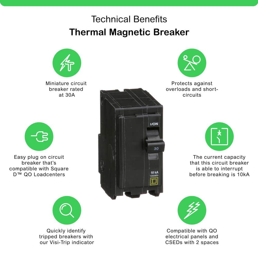 A thermal-magnetic, plug-on breaker for Square D QO panels, delivering reliable overload and short-circuit protection. Rated 30A, 120/240 VAC with 10kA interrupting capacity and a Visi-Trip indicator for quick identification of tripped circuits.