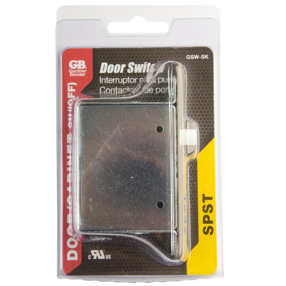 The 10-Amp Push-Button Door Switch features normally on-momentary contact. The switch includes a metal box, cover plate and mounting hardware for installation within a doorjamb with a 1-1/4 in. wide x 2-3/4 in. high x 2 in. deep mounting hole. The single-pole, single-throw circuitry automatically operates lights when door is opened.