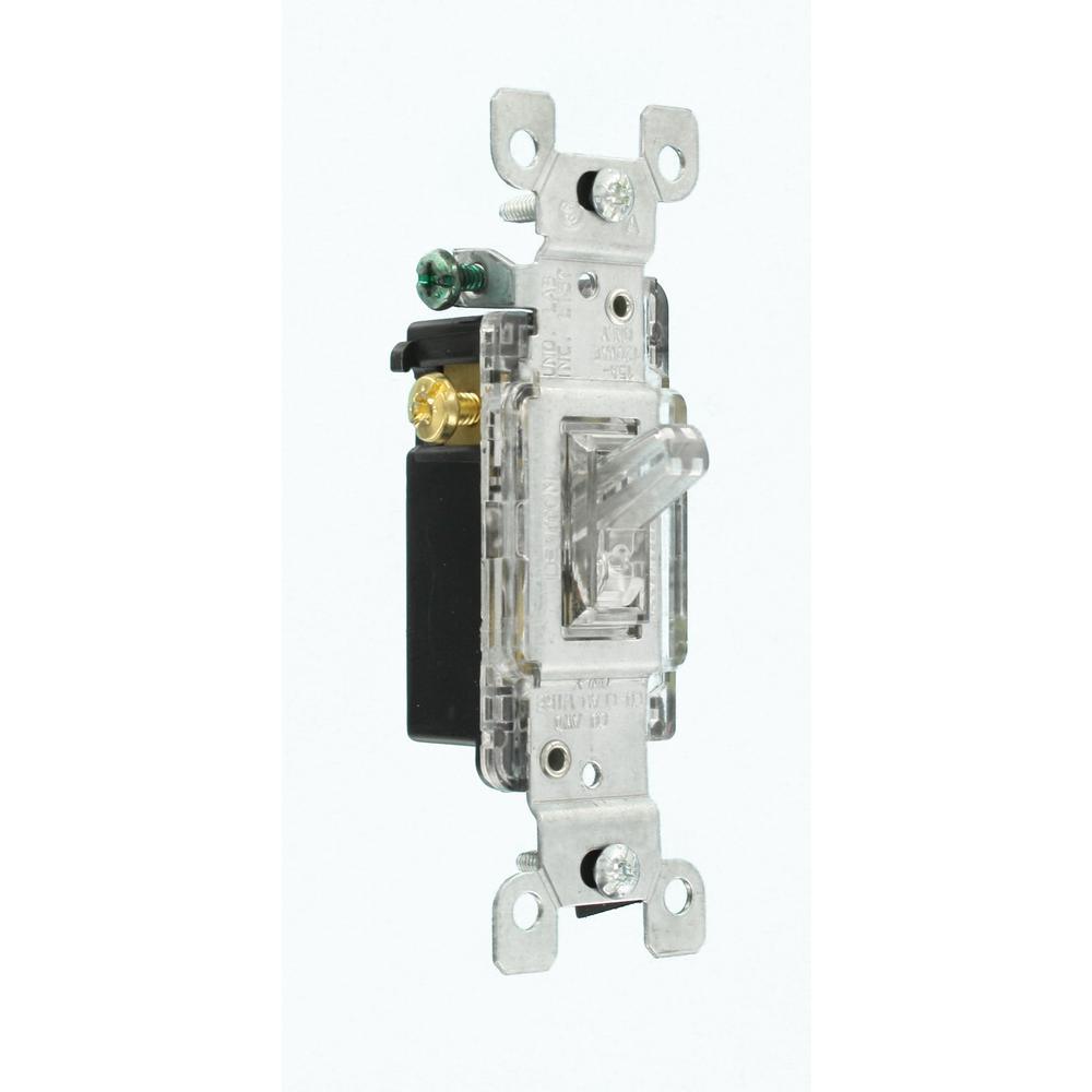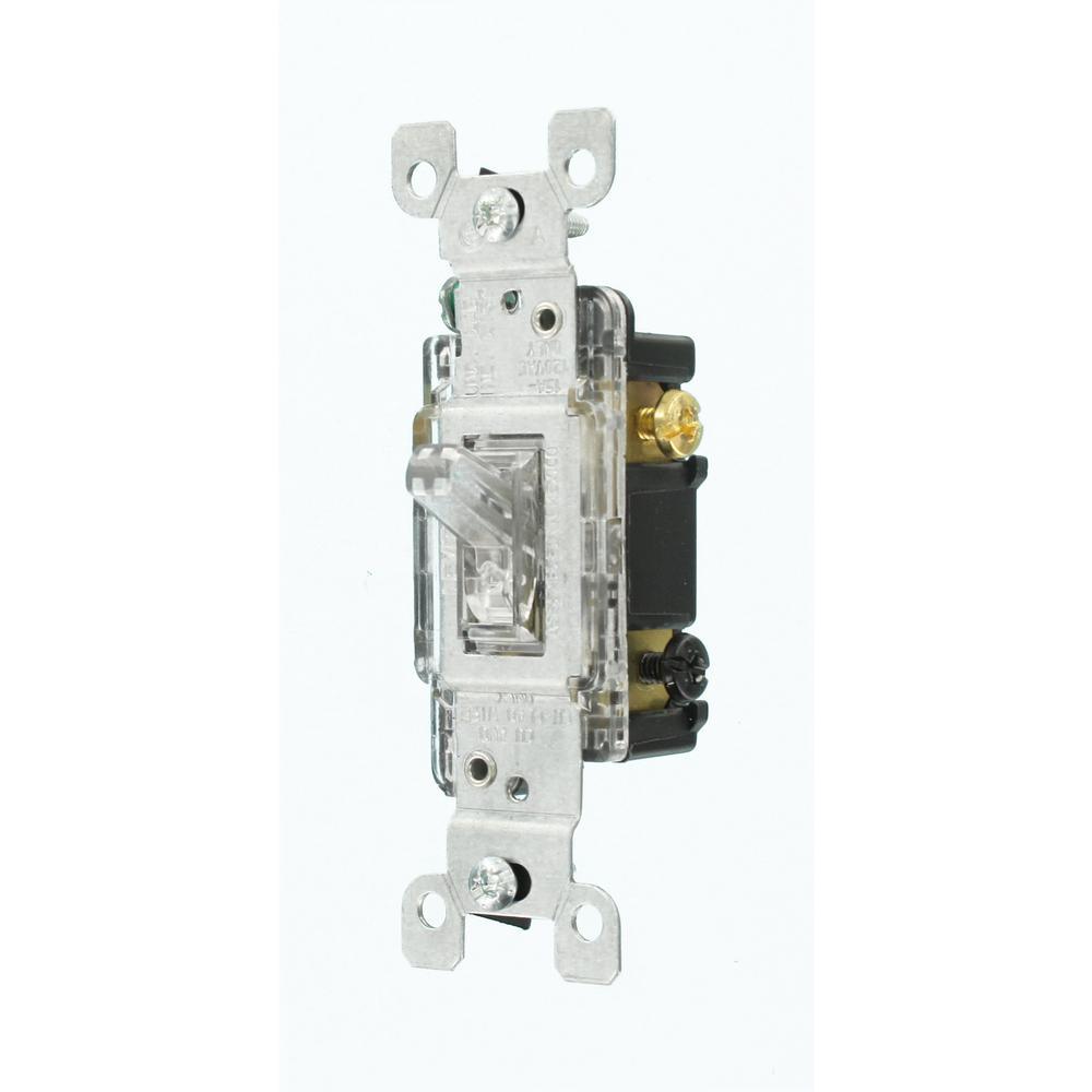 The 15 Amp 3-Way Toggle Light Switch by Leviton boasts a clear design that glows when turned off, making it easy to locate in dark environments. Designed to replace 15 Amp 3-way switches, this switch allows for light control in two locations and can be paired with a second 3-way switch in a 3-way circuit. Its illuminated feature when off ensures easy visibility in the dark.