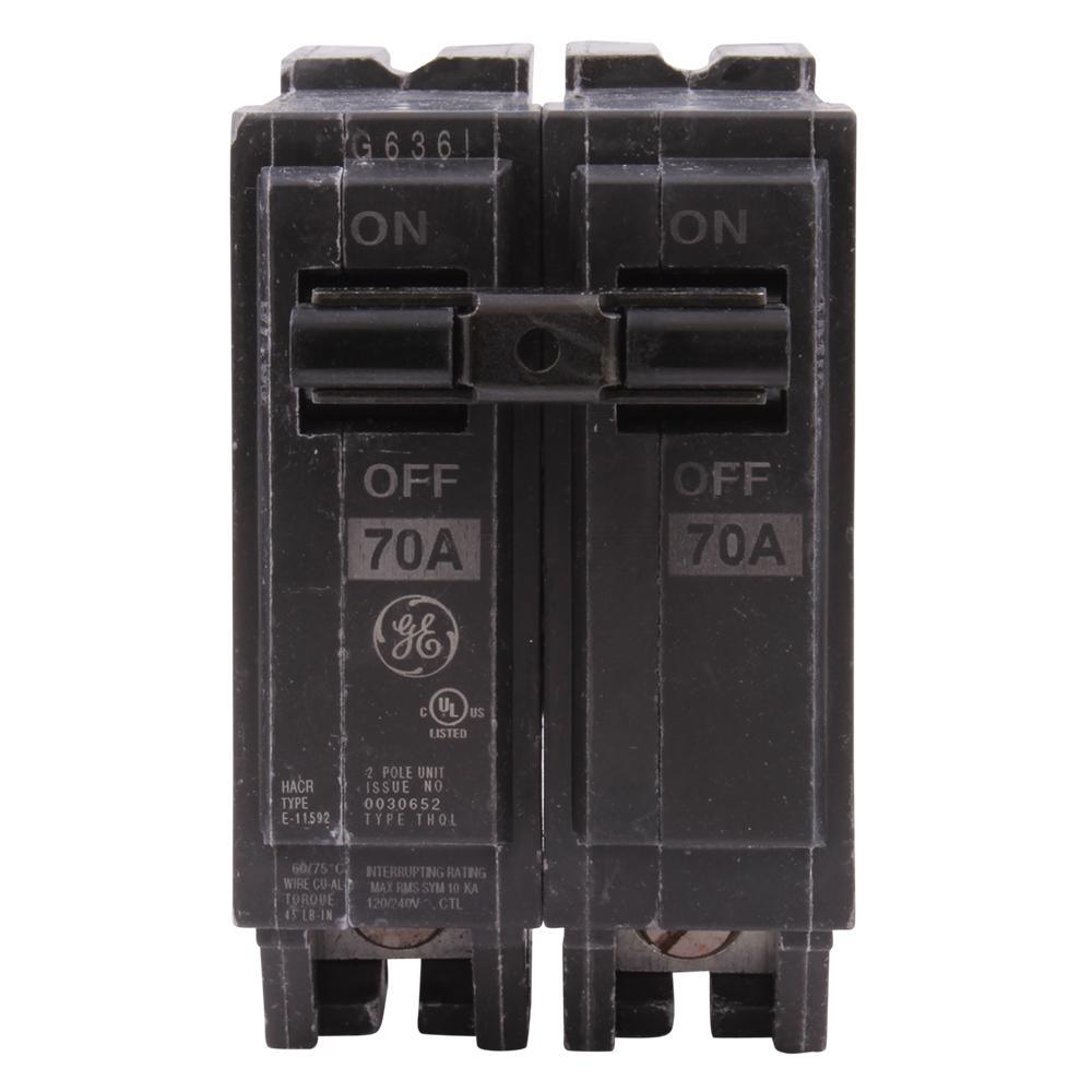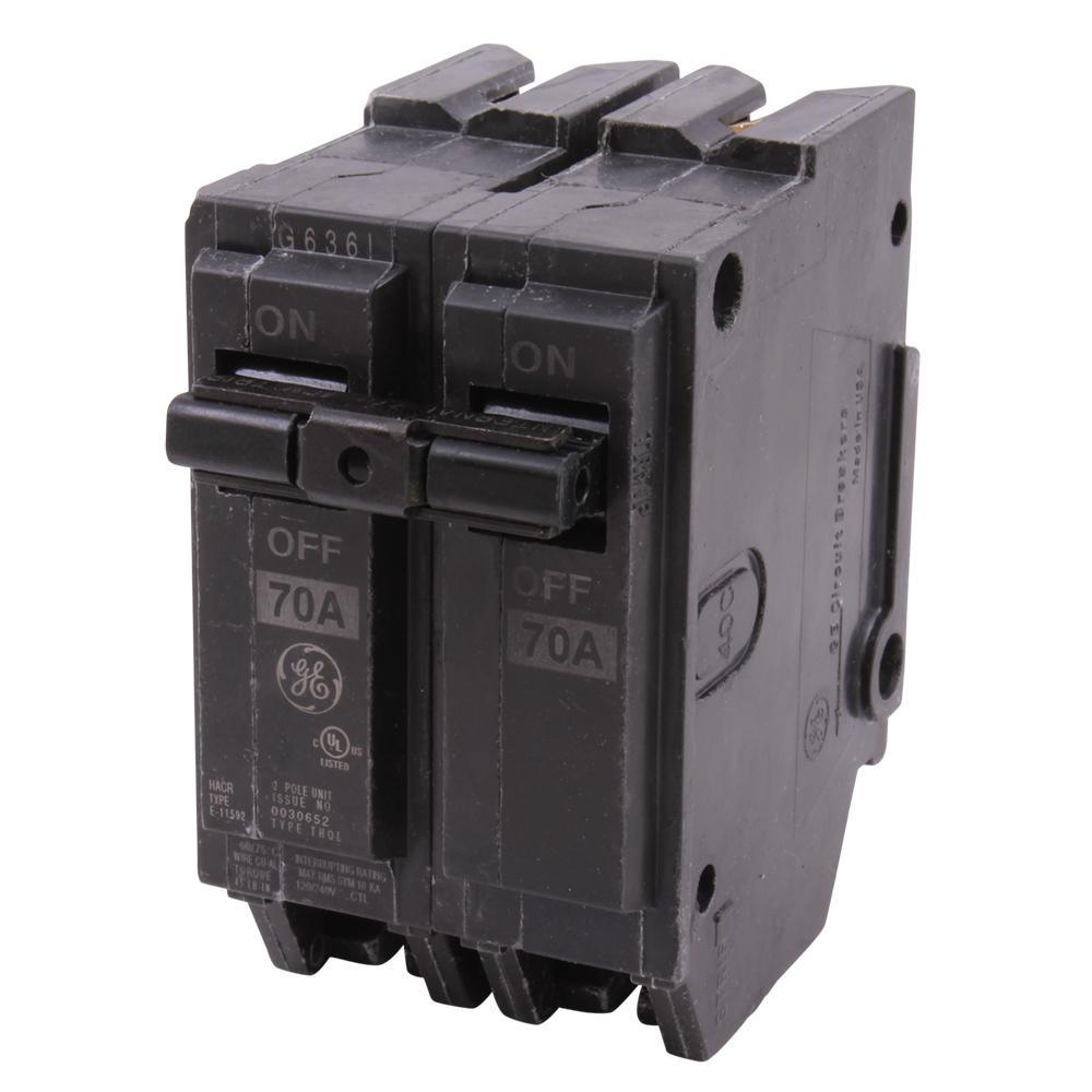 The GE 70 Amp 2 in. Double-Pole Circuit Breaker features a plug-in design for easy installation. This breaker is rated for a maximum of 70 Amp and offers 2 Poles with box-type terminals. The breaker is ANSI certified and CSA and UL listed and is also federal government specification WC-375B qualified.