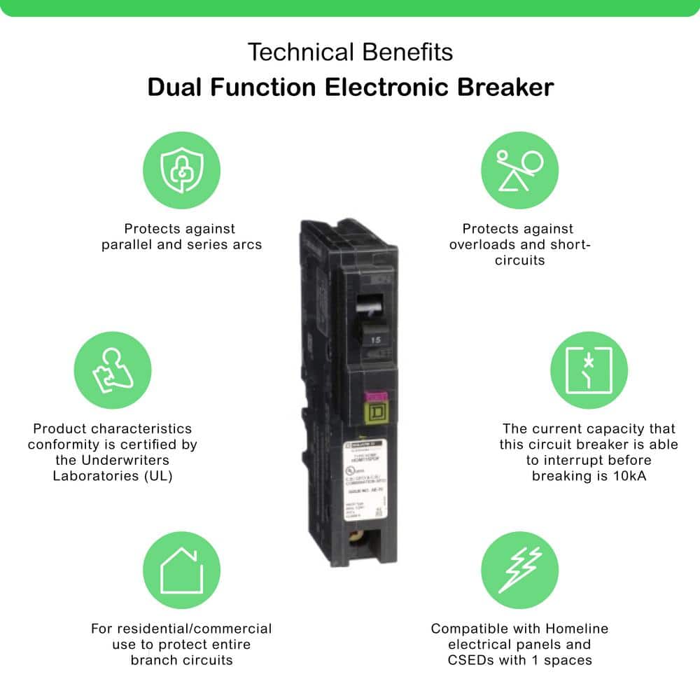 • Dual Protection: Combines Combination Arc Fault (CAFCI) and Ground Fault (Class A GFCI) in one breaker