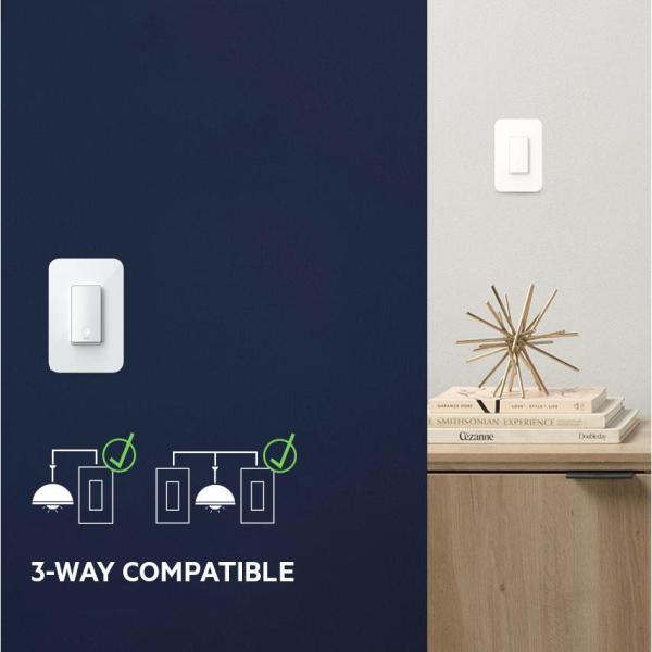 The WeMo smart light switch gives you total control over your lights with no subscription or hub required. Turn lights on and off from the wall, App, or with your voice using Apple HomeKit, Amazon Alexa or the Google Assistant. From porch lights to ceiling fans to recessed lighting, WeMo light switch can control nearly anything a traditional light switch can. Easily set schedules and timers to make your life truly comfortable. Schedule lights to turn on at a certain time or sync them to the sun. This way, you'll never come home to a dark house. Or group multiple WeMo-controlled devices together and control them all with a single 2-second press on your light switch. Light switch also can get your home vacation ready with away mode, which randomly turns your lights on and off for peace of mind. When paired with a voice recognition device or service, sold separately.