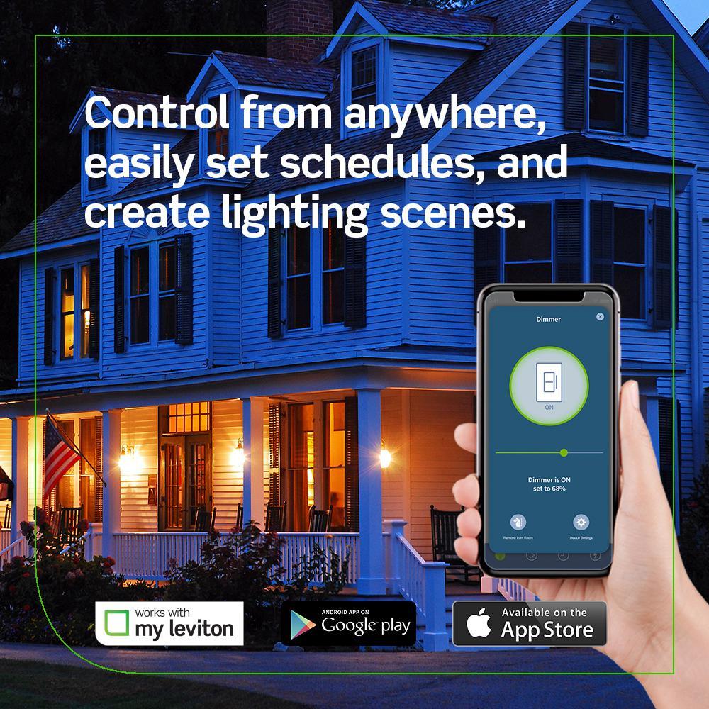 • Works with my Leviton app: schedule your lights to turn on when you want them including sunrise/sunset, easily create fun lighting scenes and control from anywhere
