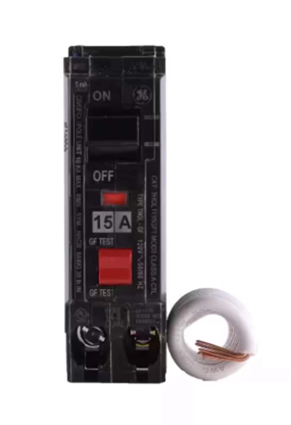 This GE Q-Line 15-amp, single-pole GFCI breaker adds ground-fault protection to 120V circuits in GE PowerMark and ABB ReliaHome load centers. It features self-test with LED indicator, 10kA interrupt rating, and is UL listed for reliable, code-compliant safety near water and outdoor locations.