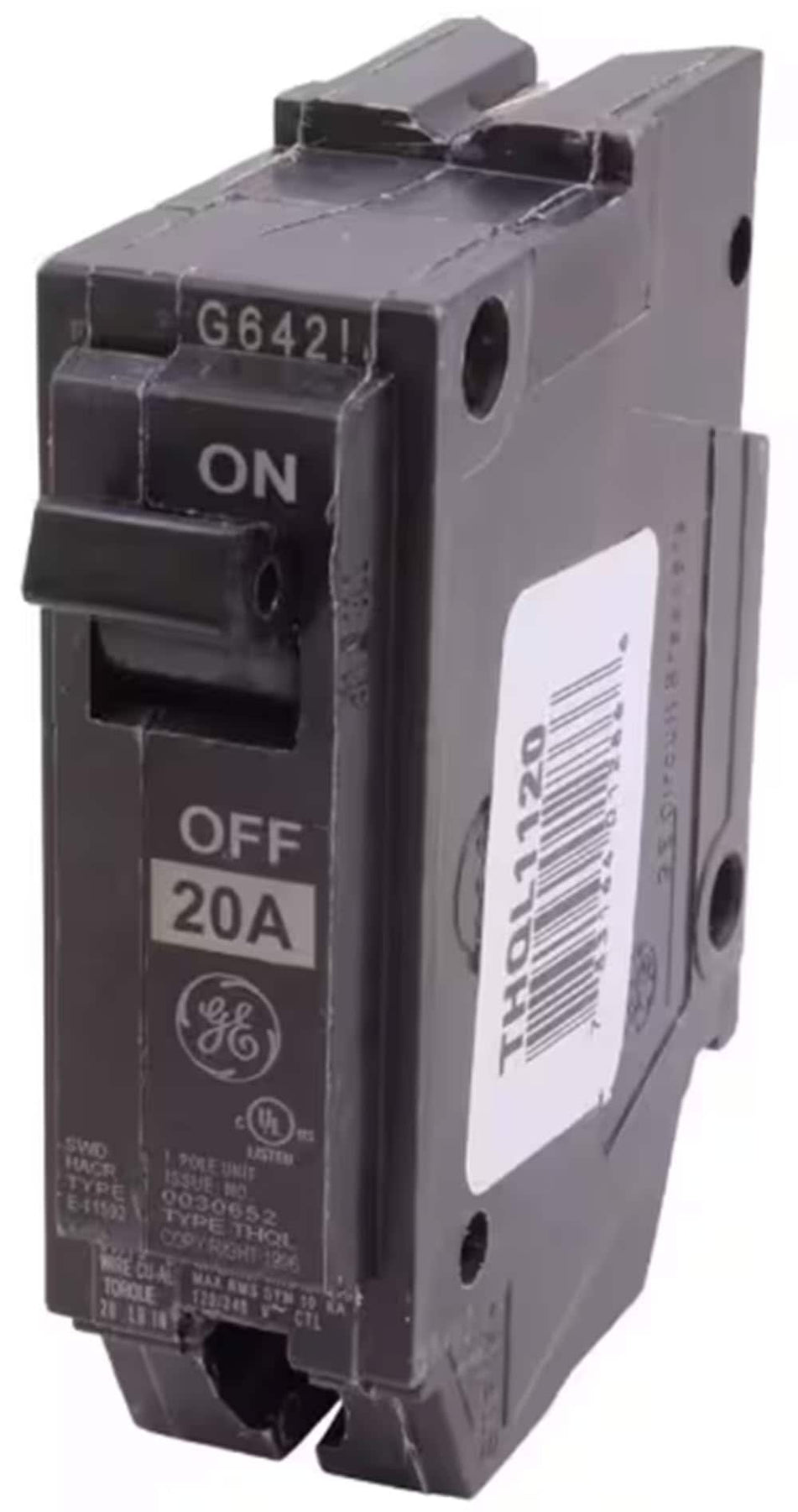 GE Q-Line THQL breakers provide reliable overload and short-circuit protection for residential load centers. This 1-inch, single-pole 20A breaker features quick-make/quick-break operation and easy-to-read trip indication, and is compatible with GE PowerMark and ABB ReliaHome panels.