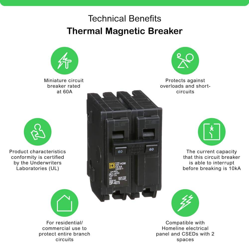 Ensure your home remains safe from electrical hazards with the Square D Homeline 60 Amp 2-Pole Circuit Breaker. Engineered for seamless integration with Homeline load centers, this breaker offers reliable overload and short-circuit protection for your electrical system. Combining robust performance with an easy plug-on design, it's the perfect solution for both professionals and DIY enthusiasts.