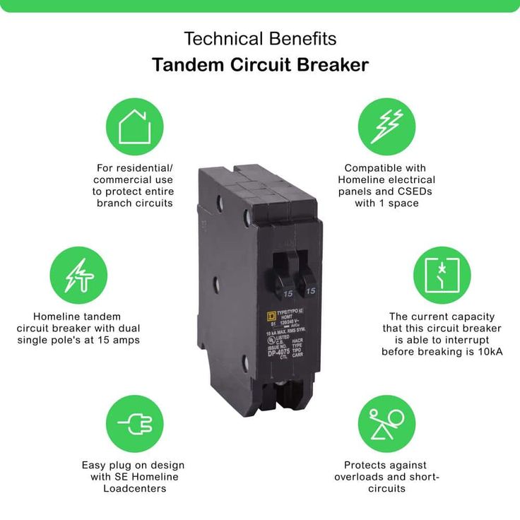 The Square D by Schneider Electric Homeline Single-Pole Tandem Circuit Breaker consists of (2) single-pole, 15 Amp breakers in 1 pole space. It is used for overload and short-circuit protection of your electrical system.