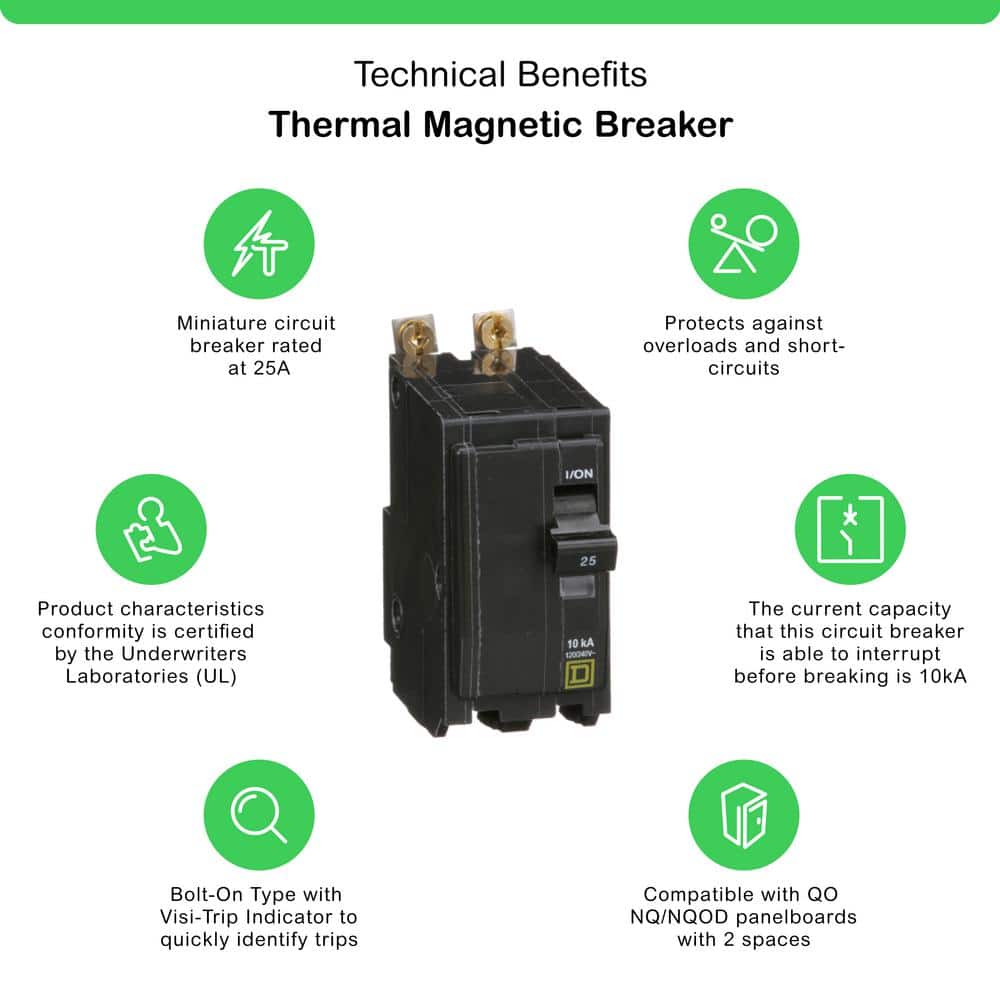 The Square D QO 25 Amp 2-Pole Bolt-On Circuit Breaker provides unparalleled protection against overloads and short circuits, boasting a robust 10,000 AIR rating. Embrace easy installation with its bolt-on design and the innovative Visi-Trip indicator that swiftly identifies a tripped circuit, ensuring efficiency and safety in your electrical panel.