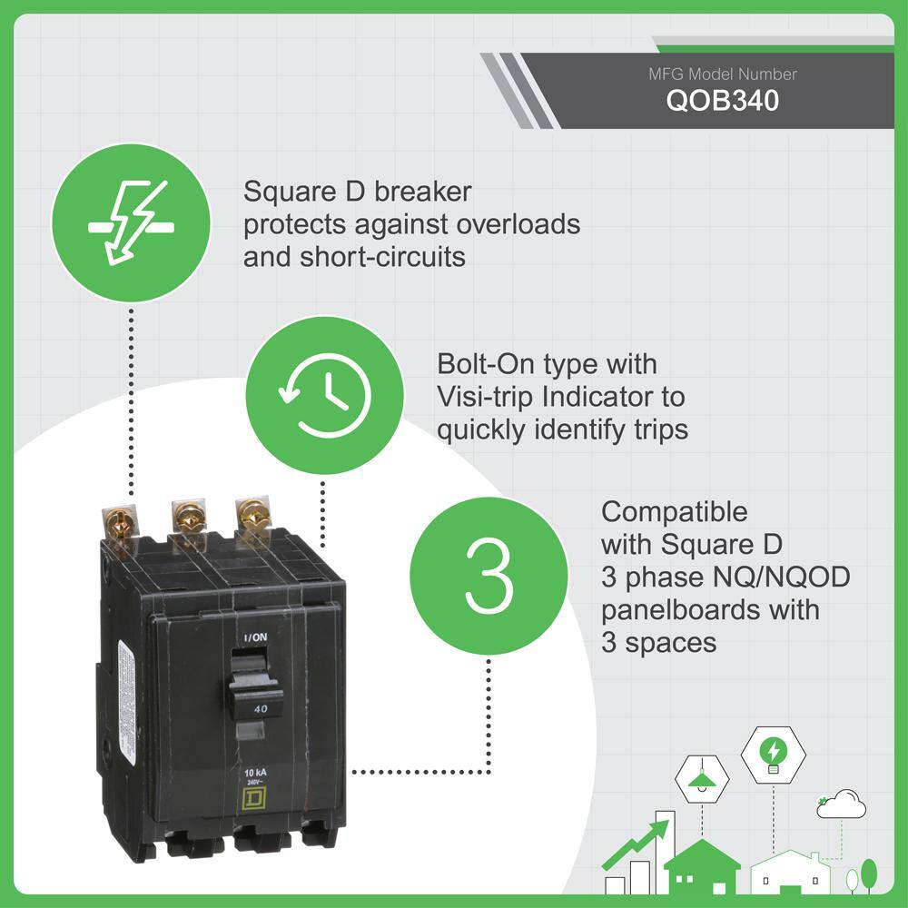 The Square D QO 40 Amp 3-Pole Bolt-On Circuit Breaker safeguards your electrical system from overloads and short circuits with unmatched reliability. Featuring the unique Visi-Trip indicator, this breaker allows easy identification of tripped circuits in a busy load center.