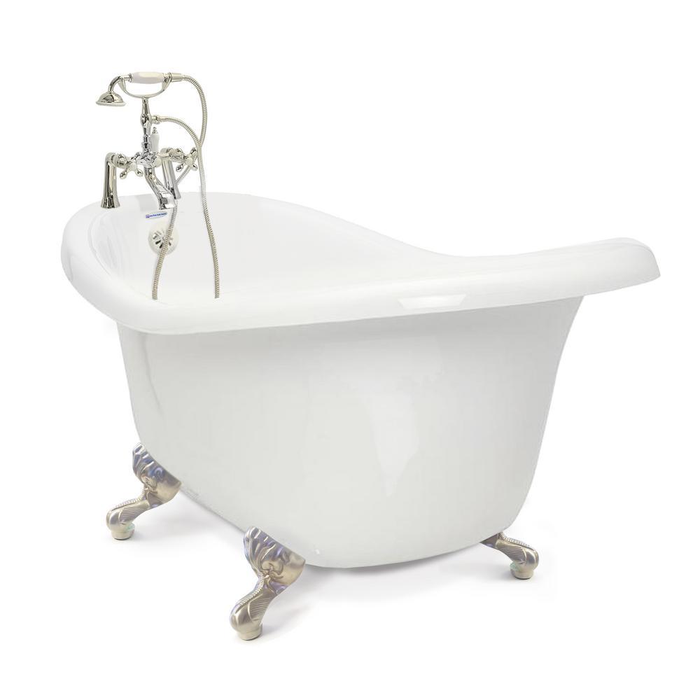 American Bath Factory presents the Chelsea Slipper Claw Foot Bathtub Packages. We offer the tub only or the complete kit which includes everything you need to transform your old bathroom from ordinary to extraordinary. The Chelsea Slipper tub is made from our proprietary material we call AcraStone, resulting in a bathtub to be beautiful and dependable for years to come. AcraStone is strong, thick and warm to the touch with a smooth porcelain like finish. The Chelsea Slipper bathtub features hand-cast metal Imperial claw feet that are available in White or you may upgrade to 3 other metal finishes (CH, SN or OB). The gentle slope allows the bather to recline comfortably for a more relaxing soak. The tub is lightweight but strong which makes this perfect for your second story bathroom. Our tubs come backed with our Limited Lifetime Warranty. Size: 60 in. L x 32.5 in. W x 29.5 in. H soaking depth: 17 in. gallons: 40Material: Acrastone is strong (chip/wear resistant) with a porcelain-like surface Bathtub is pre-drilled for faucet. This is the Chelsea Slipper Clawfoot Bathtub Package C-OB which includes the 5 ft. Slipper tub with Old World Bronze Metal Imperial Feet, F900A Deck Mount Faucet, F1100 Straight Supply Lines and F5714 Waste and Overflow Tip Toe Drain in Old World Bronze.