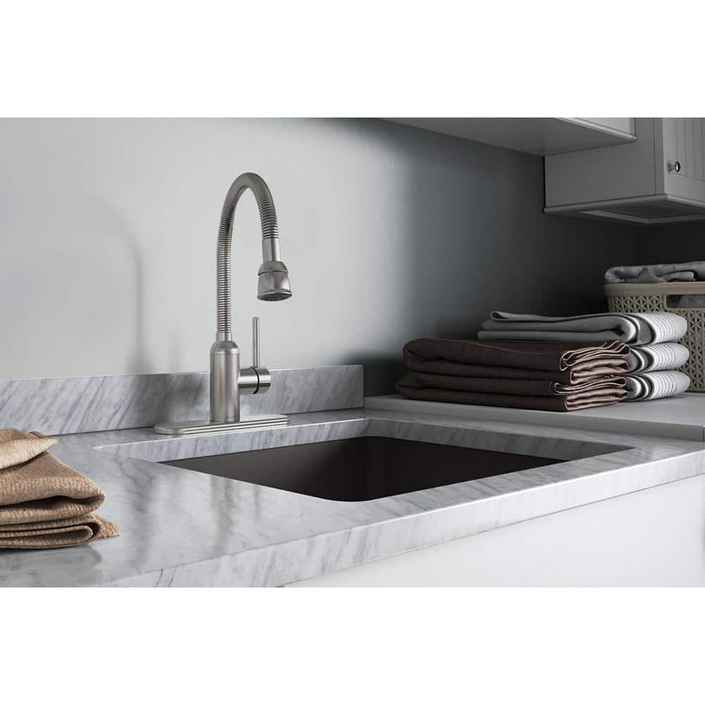 Infuse your space with the sophisticated charm of Elkay's Pursuit Utility Faucet. Its lustrous steel finish adds a touch of modern elegance to otherwise mundane utility spaces, while its flexible spout design captivates with both form and functionality. Envision it framed against a chic tile backdrop, elevating your laundry area to a realm of contemporary luxury. Indispensable for both its aesthetics and utility, this faucet reinvents the simple act of washing into a refined experience.
