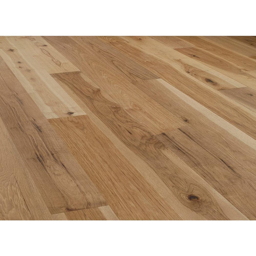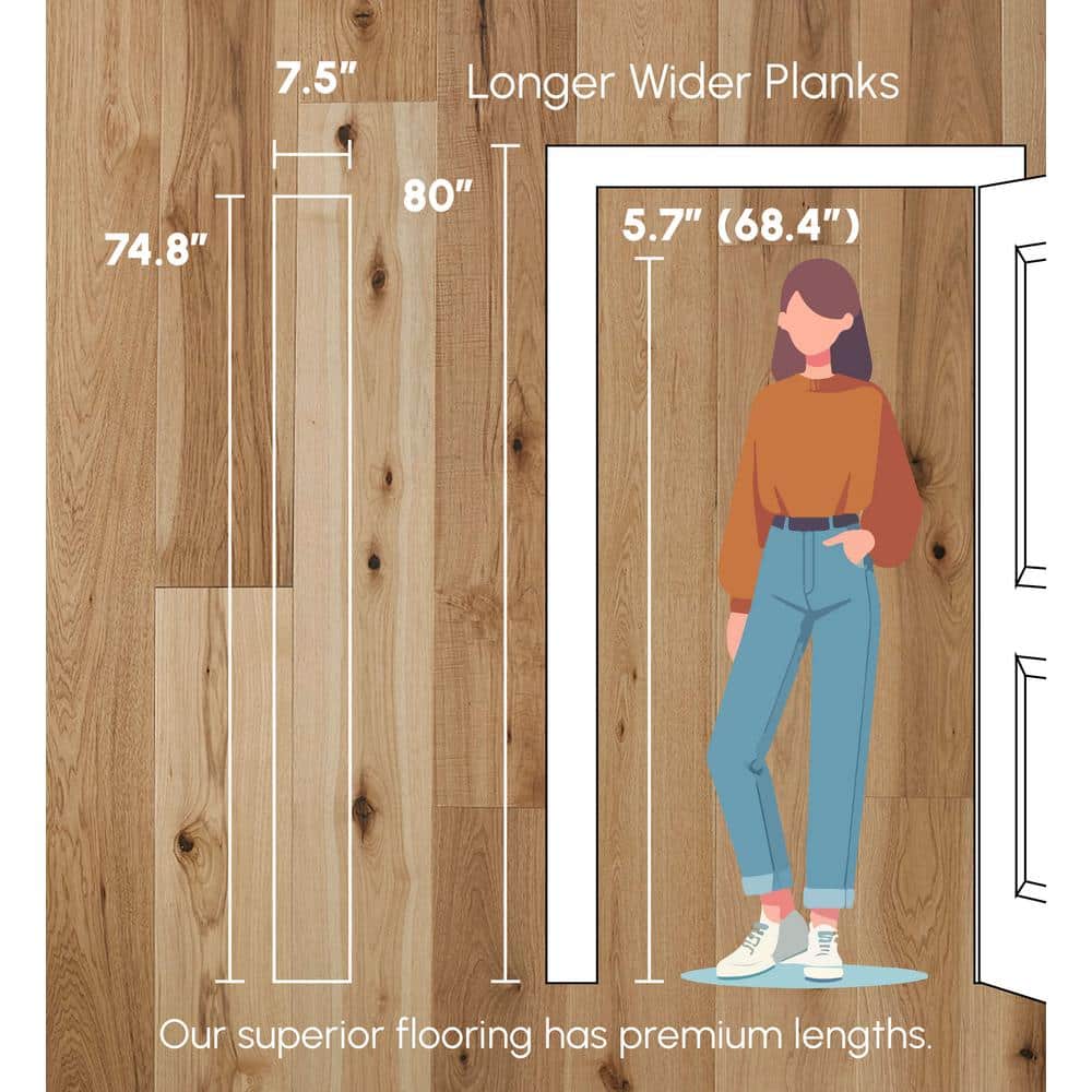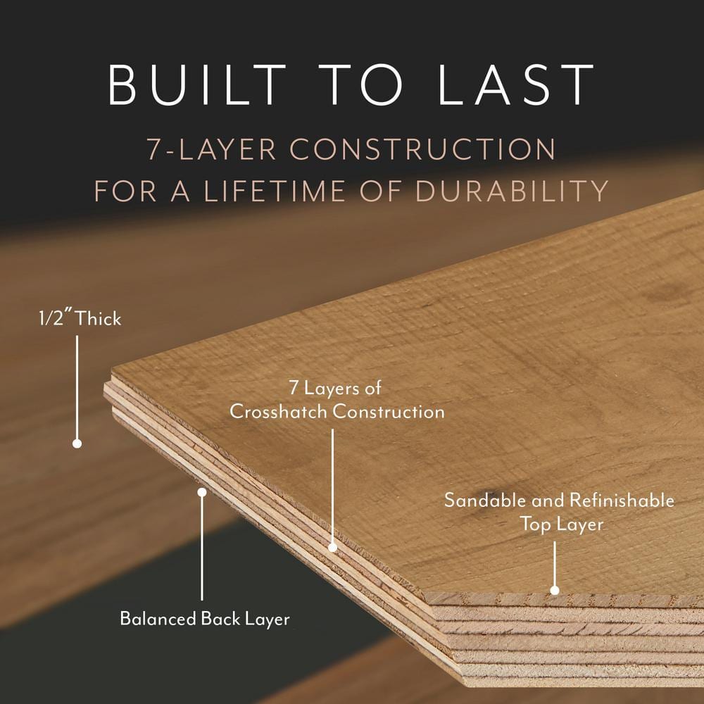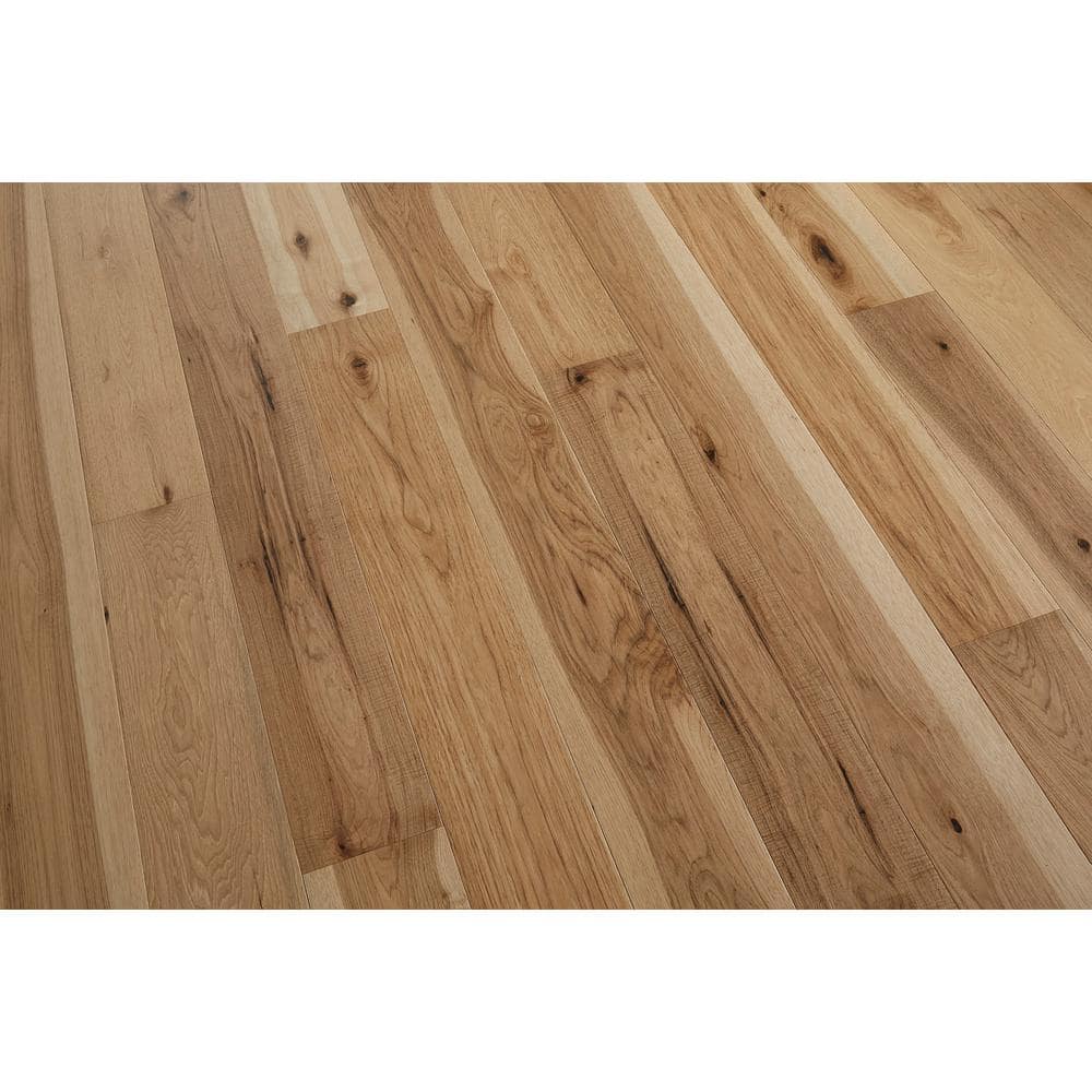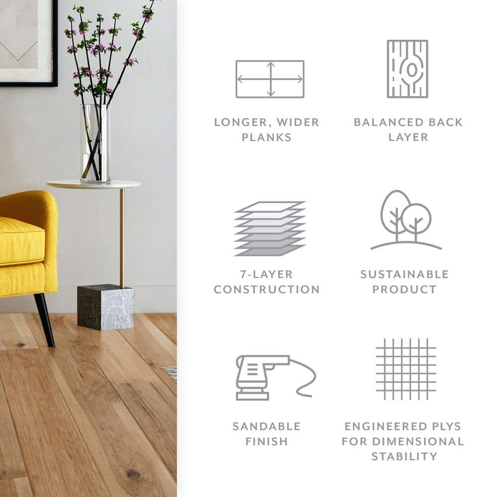 • Material: Prefinished hickory engineered hardwood with a low-gloss finish for a sleek, modern appearance.