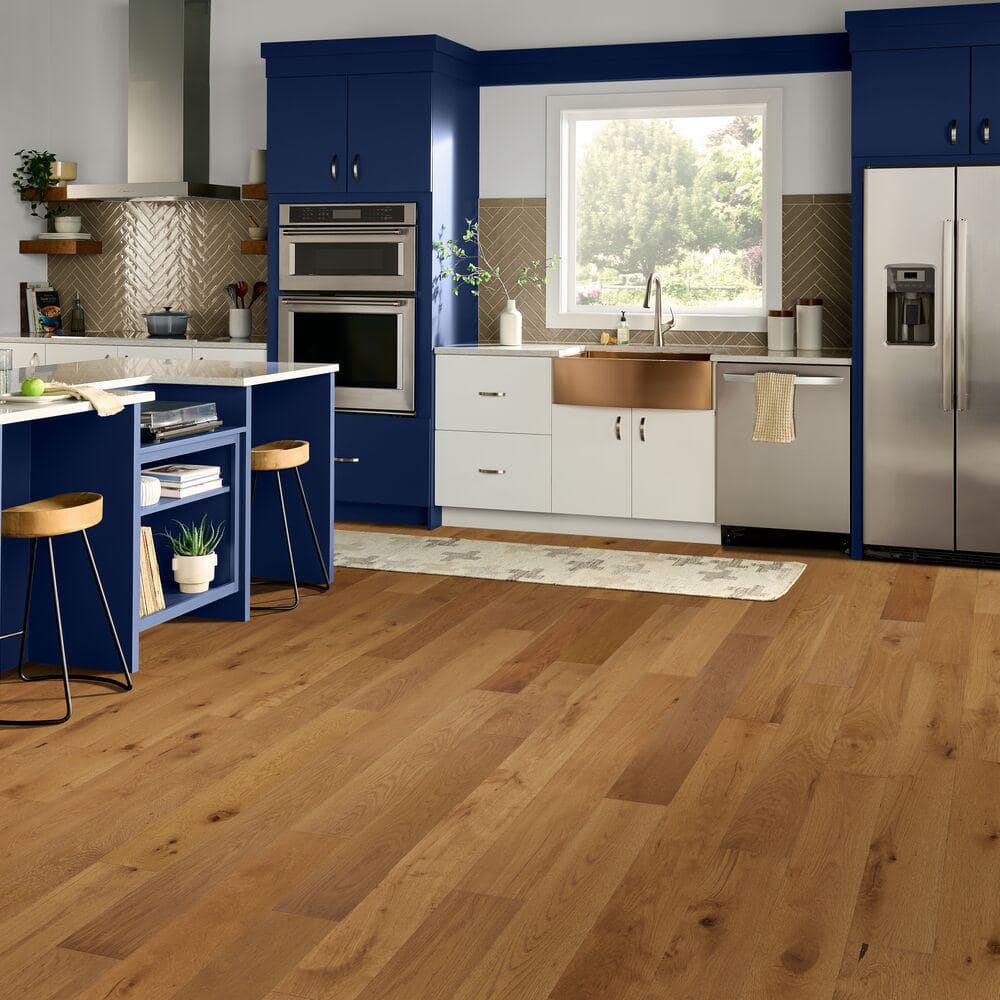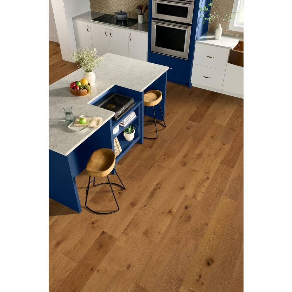 Elevate your space with Bruce's Time Honored Caramel Treasure Oak Flooring. This engineered hardwood delivers the captivating richness and texture of authentic oak, enhanced with modern hand-scraping and wire-brushing techniques. Filled with character, each plank adds warmth, durability, and touch-up capability to meet both aesthetic and functional flooring needs.