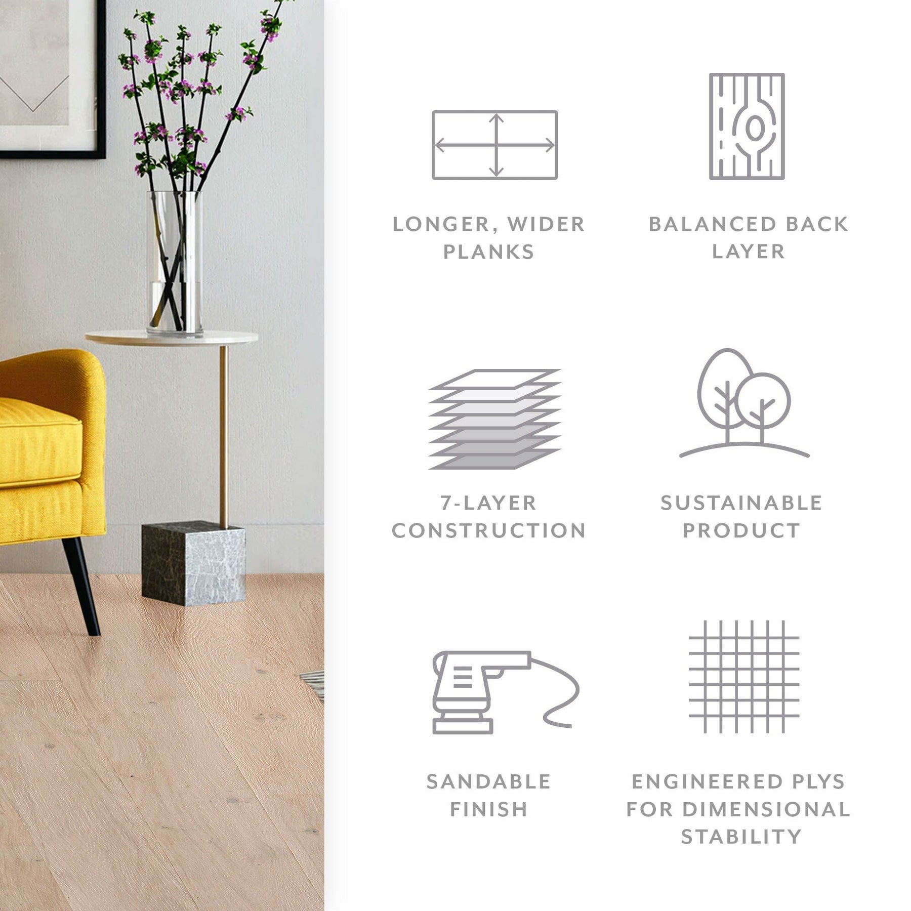 Transform your space with Element Flooring's Irving Park Dewdrop European White Oak Flooring. This water-resistant, wirebrushed engineered hardwood features a sophisticated matte finish that enhances any room while ensuring lasting durability. Perfect for high-traffic areas, it adds value to your home with the classic elegance of real wood.