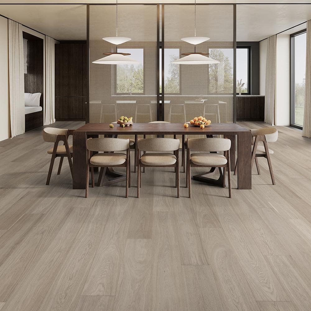Revamp your space with Malibu Wide Plank's Newport French Oak Engineered Hardwood Flooring. Its hand-brushed, wide 7.5-inch planks bring timeless elegance and durability, featuring a sophisticated low-gloss urethane finish with aluminum oxide. Ideal for both residential and light commercial settings, it offers unmatched beauty and lasting performance.