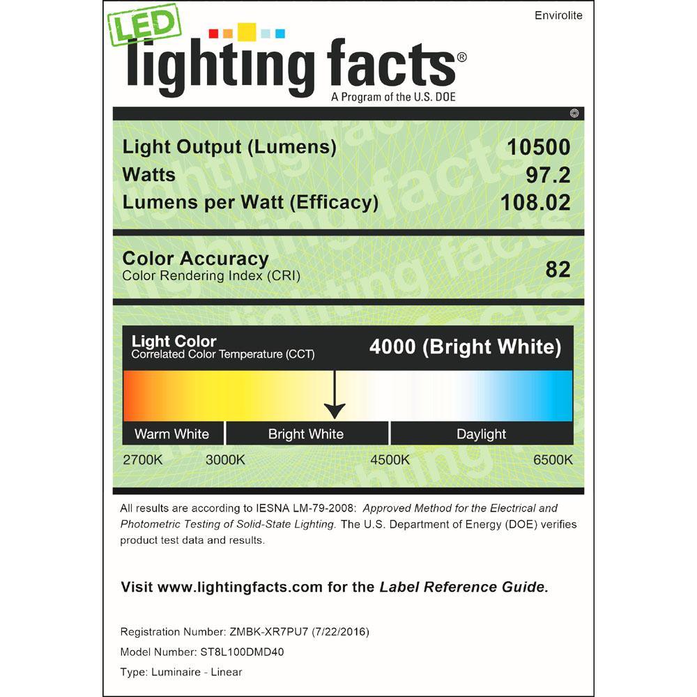 EnviroLite LED strip lights are the perfect solution for commercial lighting needs. These light fixtures are designed to save energy and lower maintenance costs. The LED light source uses 30% less power to produce the same amount of light as fluorescent light bulbs, and it's maintenance free. Because it's LED, you will never hear the hum that fluorescent fixtures make. This commercial lighting strip provide bright white 4,000K CCT light at 10,000 Lumens. EnviroLite uses quality LED chips that last for 50,000 hours of continuous use. The fixture comes with a 5 year warranty. Fixtures are UL listed and can be installed in damp locations. The fixture is DLC listed to qualify for commercial lighting rebates and special incentives in certain areas.