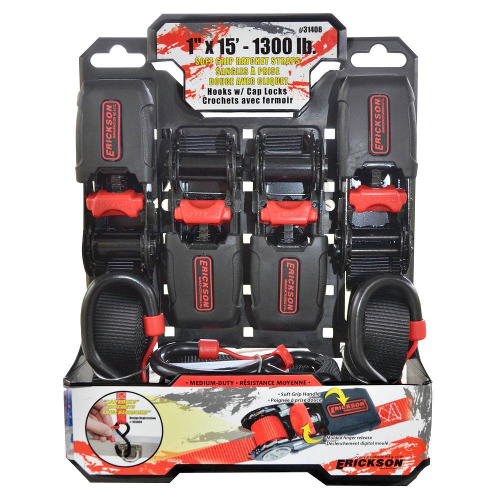 Erickson 31408 contains four (4) soft grip ratchet straps with cap locks. Rated for 1300 lbs. each, these medium-duty durable ratchet straps are each 1 in. W x 15 ft. L. using the soft grip ratchet handle and molded finger release will reduce hand fatigue and pressure. Know your paint finish will be protected with these vinyl hooks. Be assured that your load is secure because these hooks feature cap locks. As a leader of tie-down and towing products in North America, Erickson strives to provide the safest products available with the consumer in mind. Tie it. Tow it. Load it. Count on Erickson.