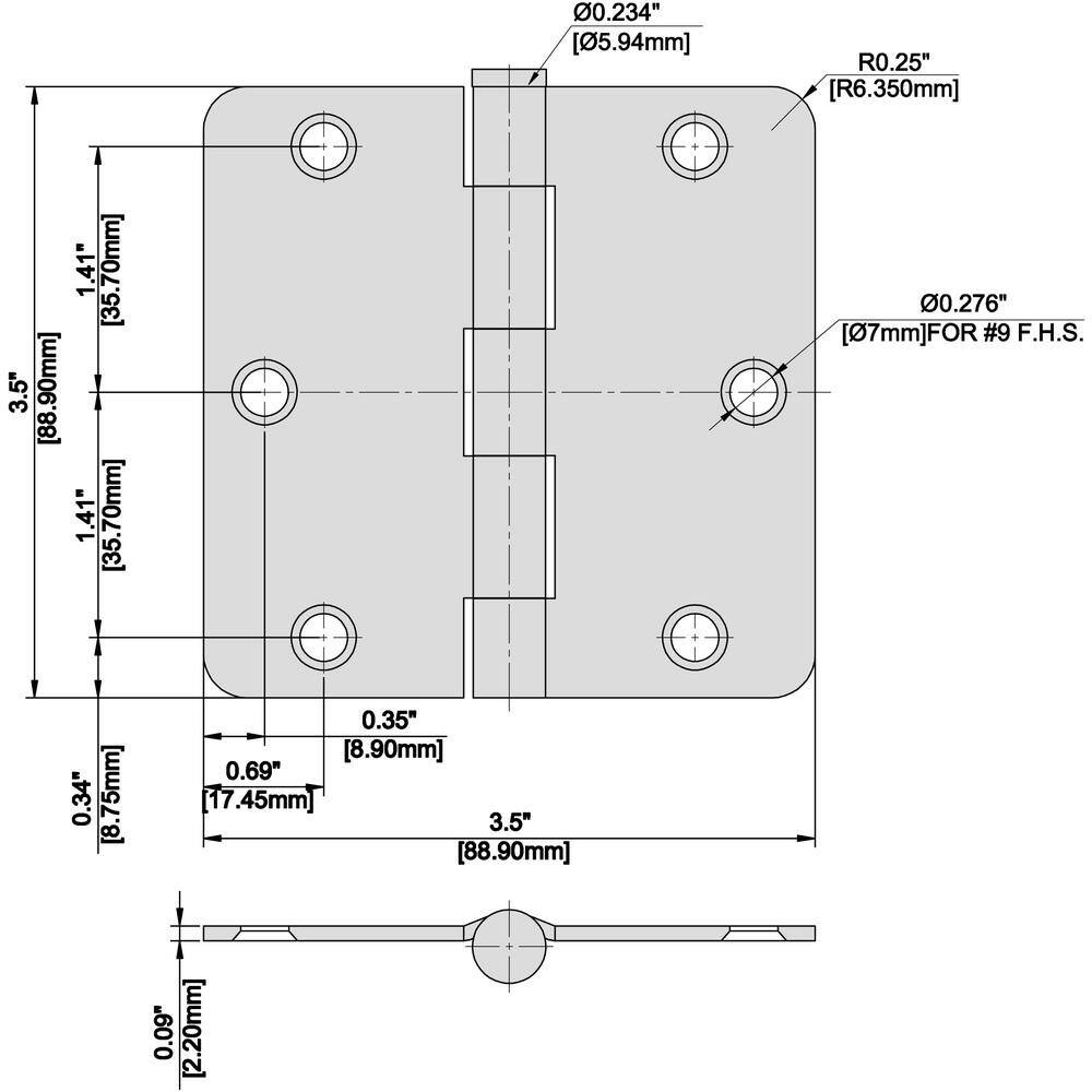 A: Each hinge measures 3-1/2 in. high with 1/4 in. radius corners.