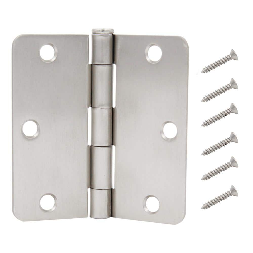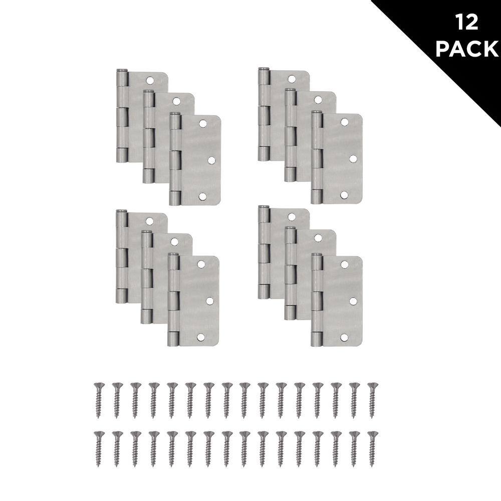 This Everbilt value pack includes twelve 3-1/2 in. butt door hinges with a 1/4 in. radius in a durable satin nickel finish. Made of steel with a removable pin for easy door installation or removal, each hinge comes with mounting screws for straightforward, mortised installation.