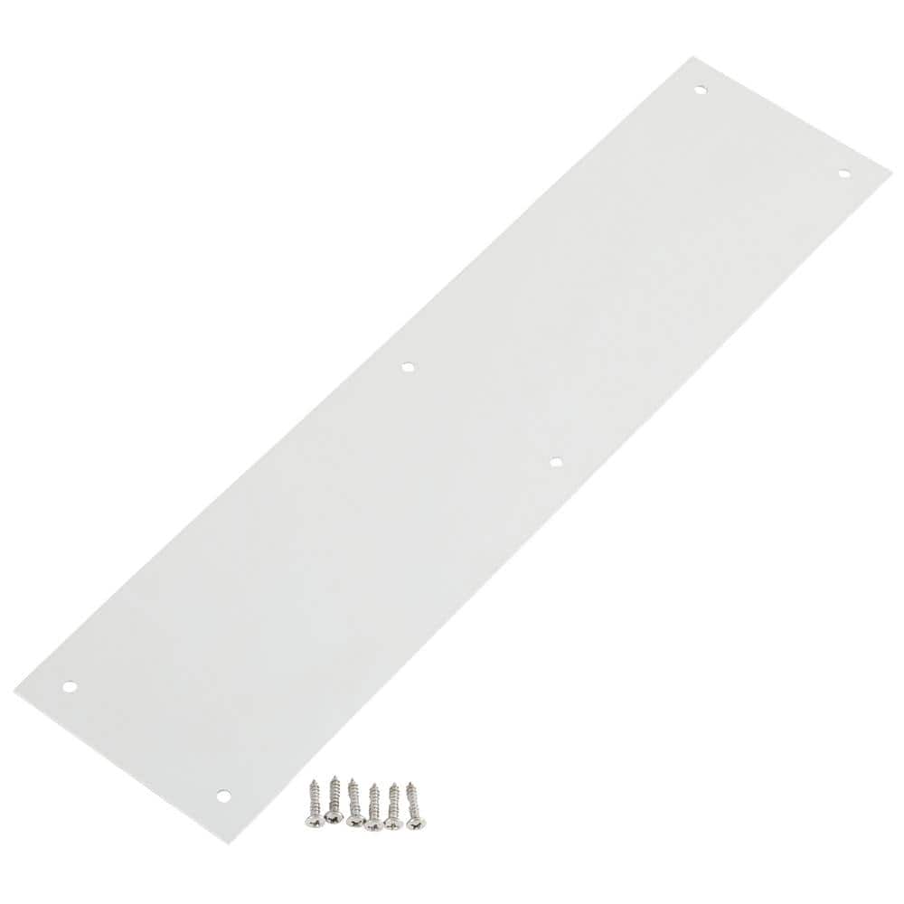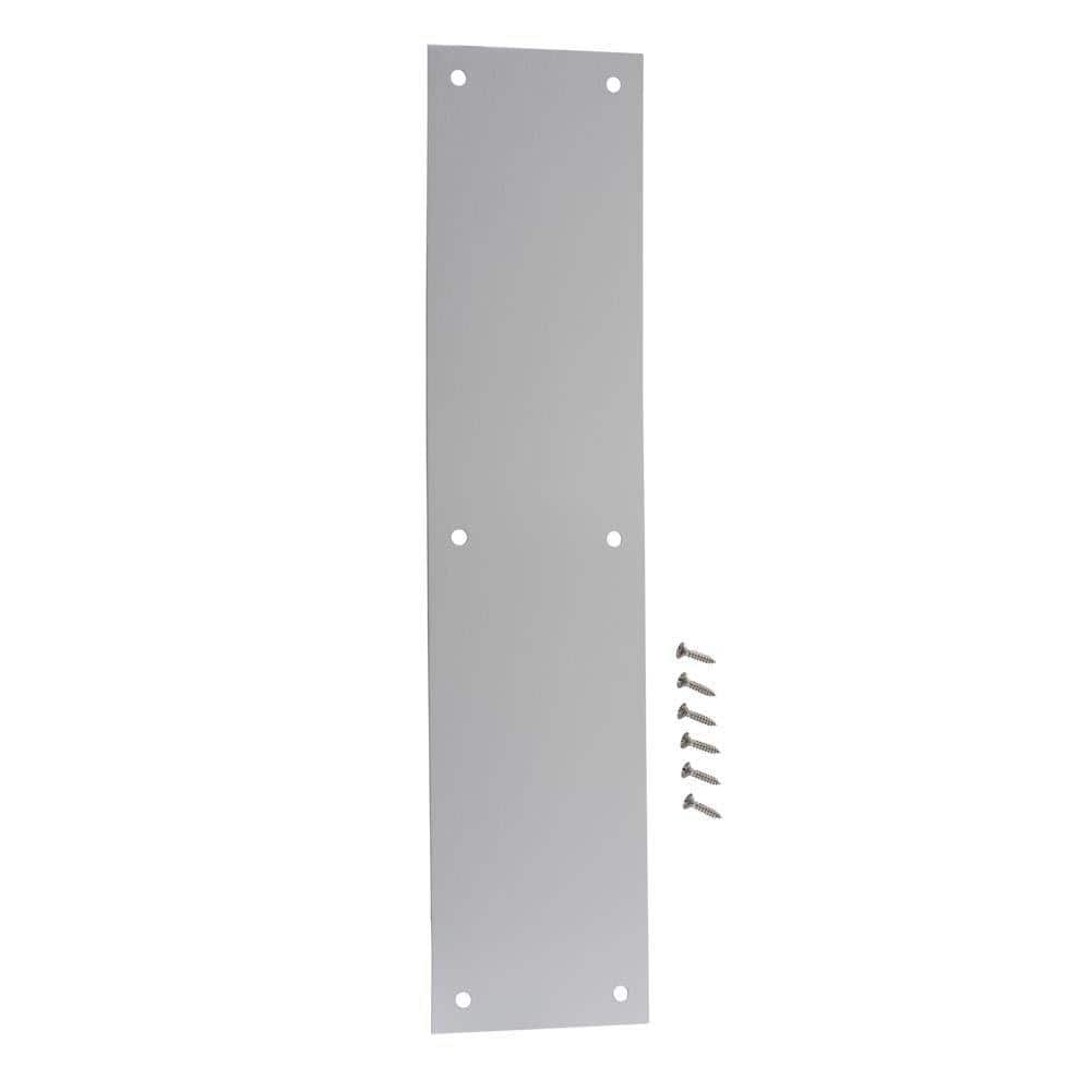 Protect high-traffic doors with this Everbilt satin aluminum push plate. Built from durable aluminum with a sleek satin finish, it shields door surfaces from scuffs and wear. Predrilled mounting holes and included screws make installation quick on commercial or residential doors.