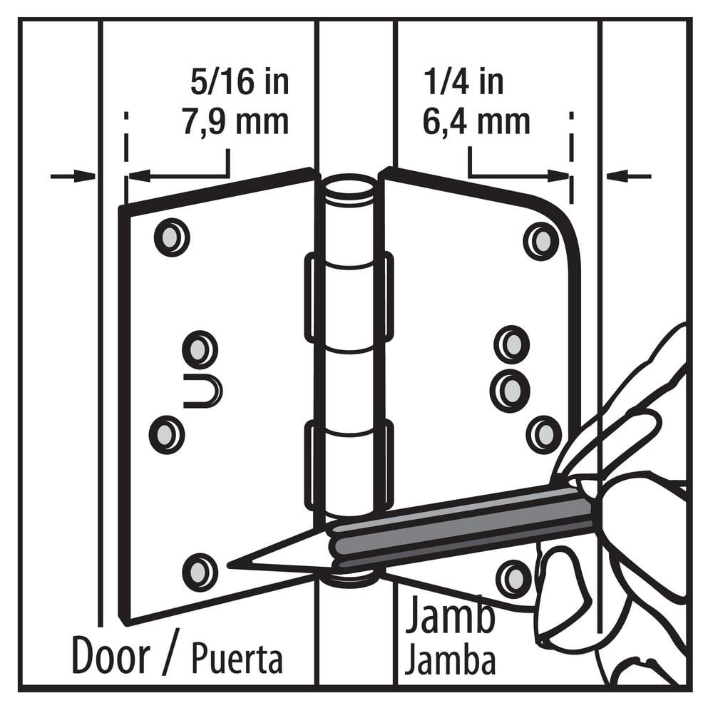 Heavy-duty residential hinge combining one square corner and one 5/8 in. radius corner for versatile door fits. Steel construction with a satin nickel finish and a stamped security tab prevents door removal when closed, even if the pin is taken out. Includes matching screws for quick installation.