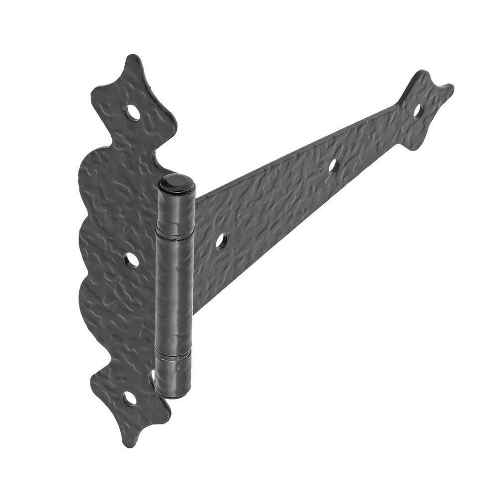 Add a touch of rustic charm to your gates or shed doors with the Everbilt 8 in. Black Decorative Tee Hinge. Designed for right or left-hand applications, this steel hinge offers reliable strength with offset screw holes to prevent wood splitting. Its stylish black finish and sturdy construction make it an essential component for any home improvement project.
