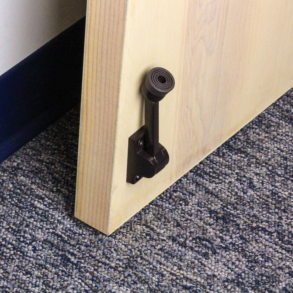 Commercial-grade kick-down door stop made of solid brass with an oil-rubbed bronze finish. Flips down to hold doors securely and lifts up to stay out of the way, protecting walls and floors. Includes mounting screws for quick installation.