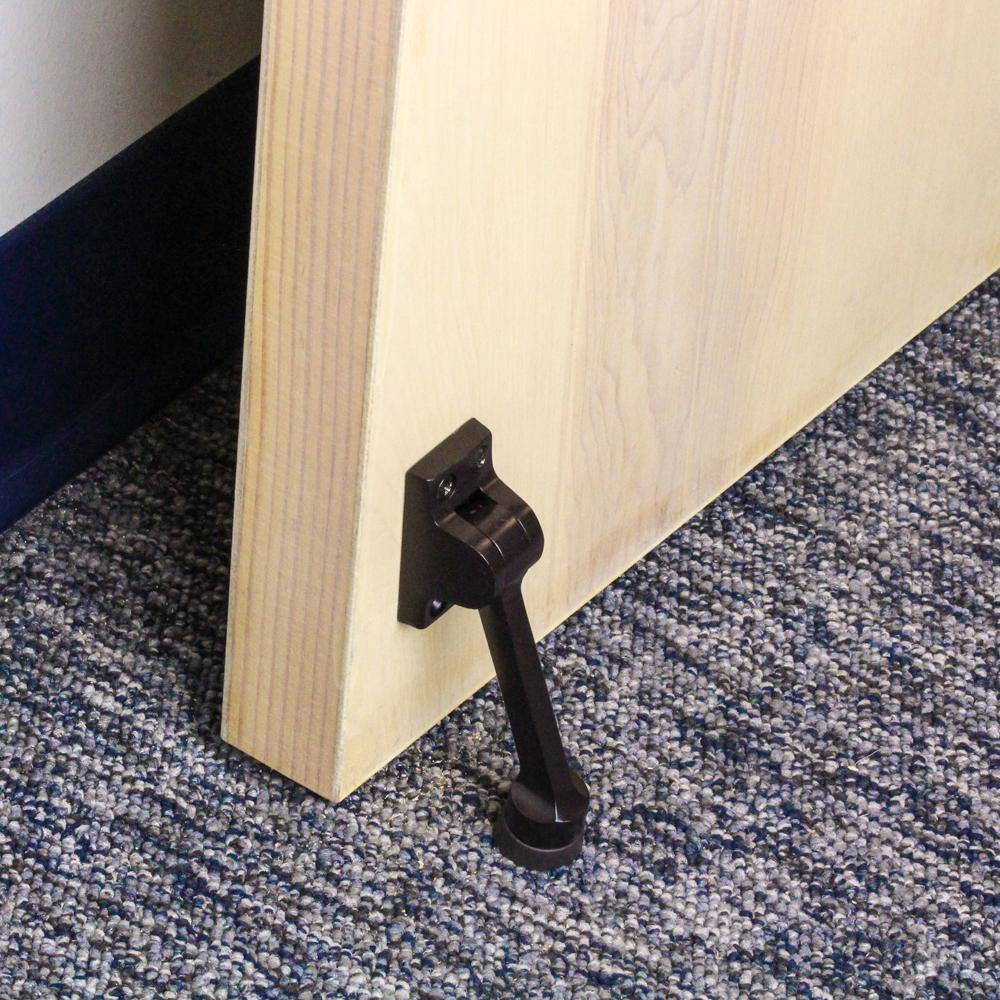 A: Flip the arm down so the rubber foot contacts the floor to hold the door; flip it up and a spring holds it in place when not in use.