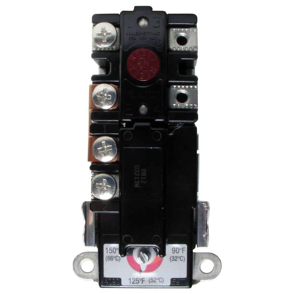 Energy-efficient replacement thermostat for single-element electric tank water heaters. Offers adjustable temperature range from 90°F to 150°F with manual reset for safety and reliable snap-action performance.