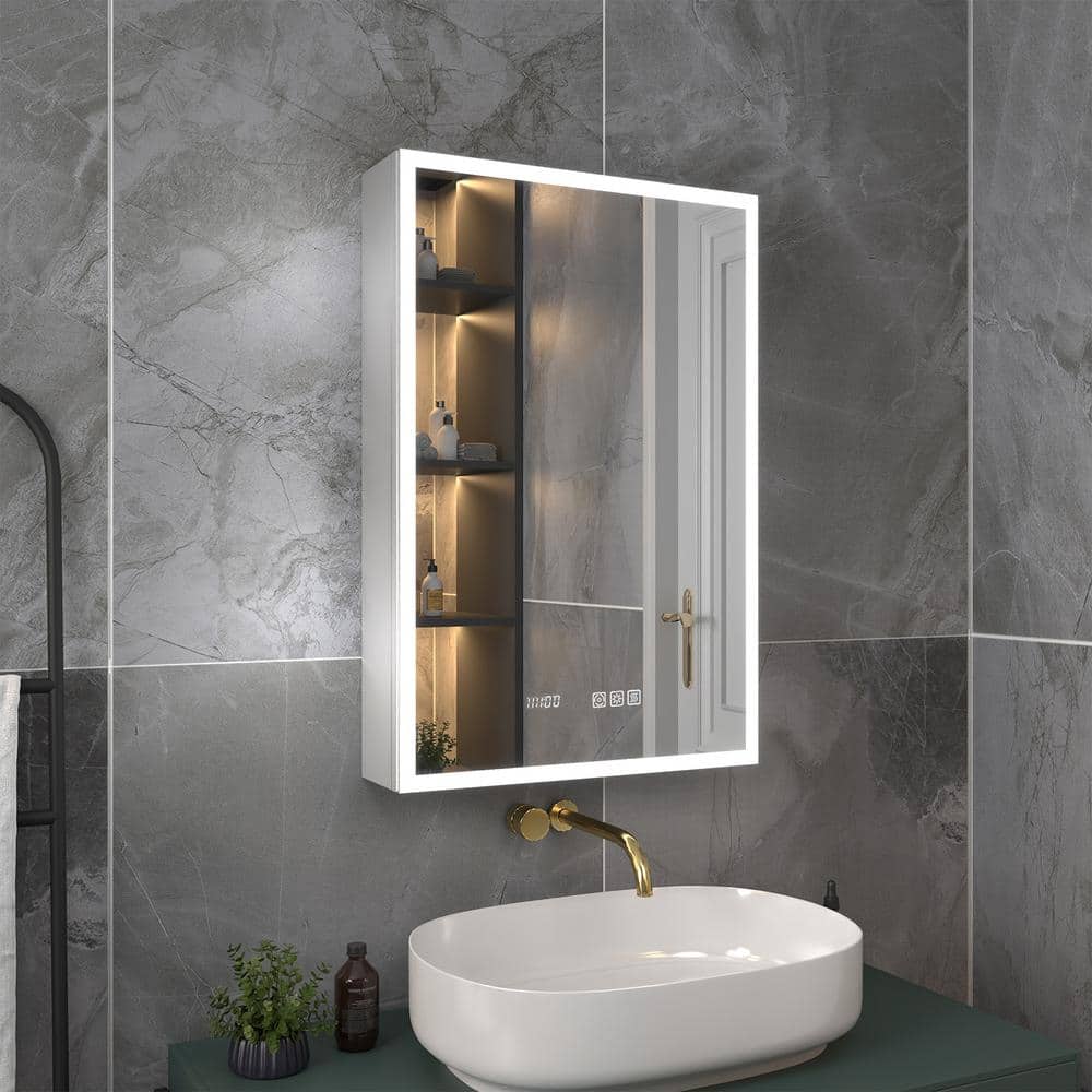 Elevate your bathroom's style and functionality with the ExBrite 20x30" Medicine Cabinet, designed with a sleek aluminum build. This recessed or surface-mounted cabinet features a mirrored door with integrated LED lighting and a practical clock, making it a modern essential for any bathroom. Its thoughtful design includes fog-free technology and USB/electrical outlets to keep you connected with ease.