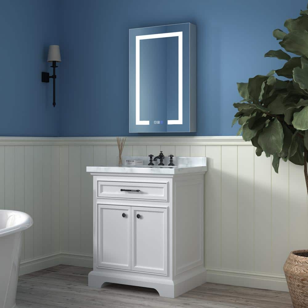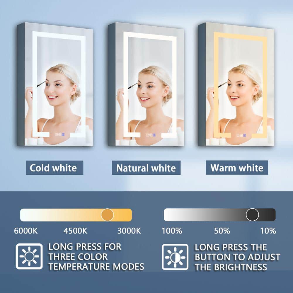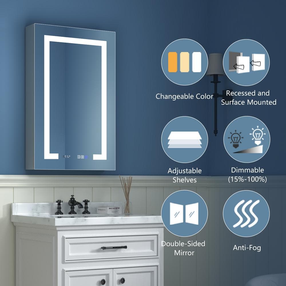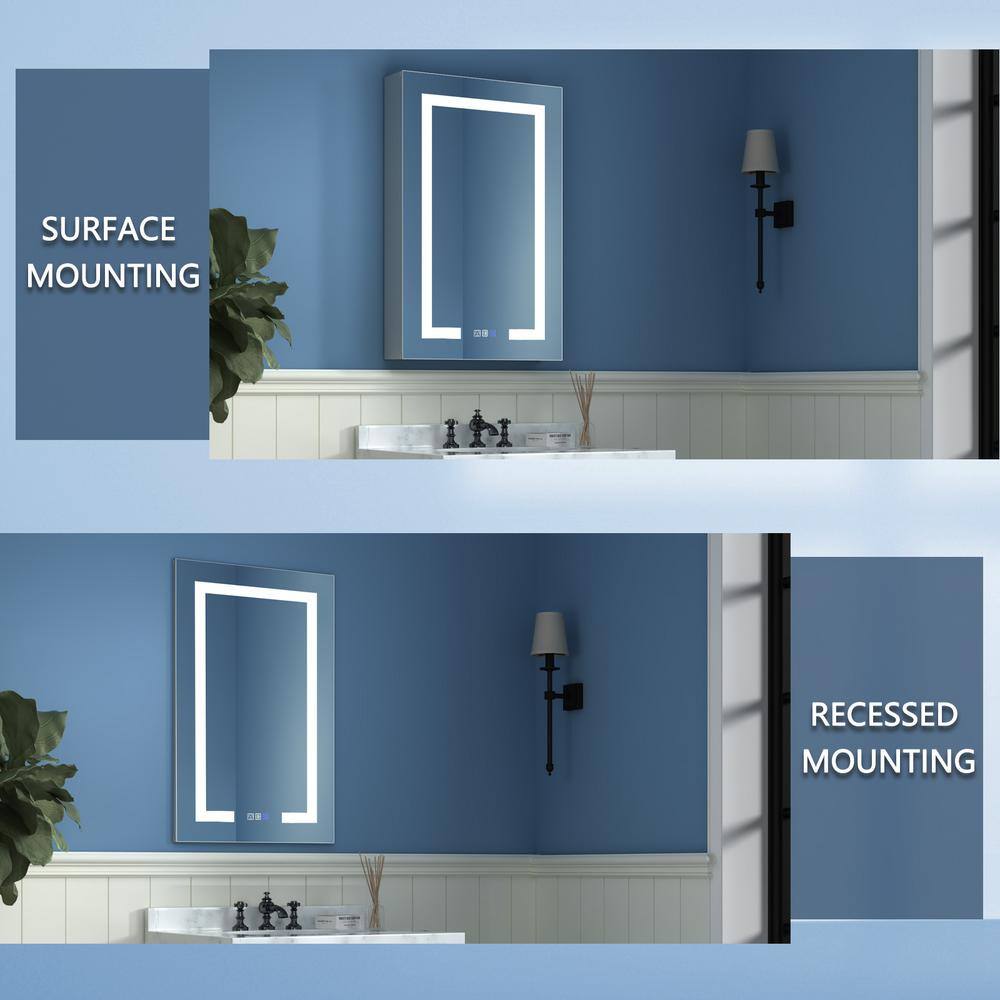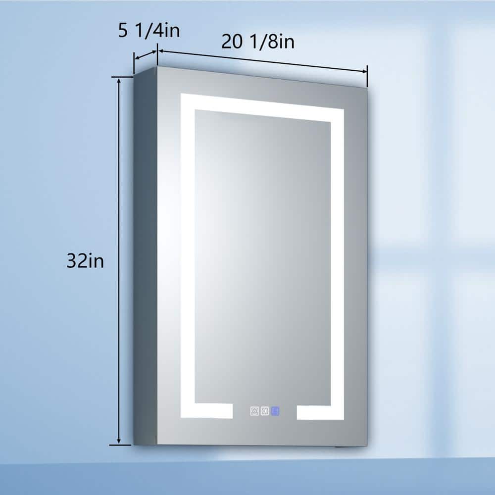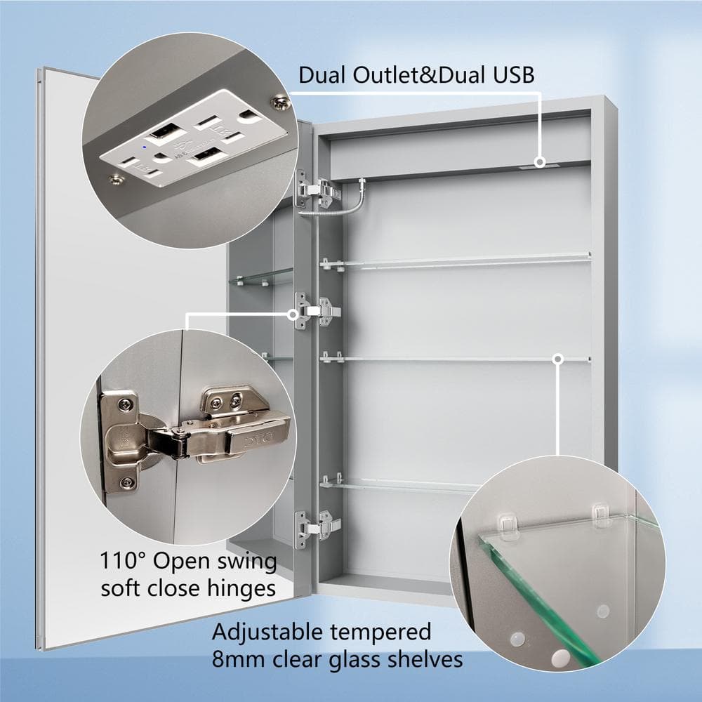 Elevate your bathroom's functionality and style with the ExBrite 20 in. x 32 in. LED Medicine Cabinet. Featuring a sleek, frameless design and integrated LED lighting, this cabinet is perfect for makeup application and grooming. Enjoy modern convenience with its anti-fog technology, adjustable shelves, and built-in USB and socket outlets.