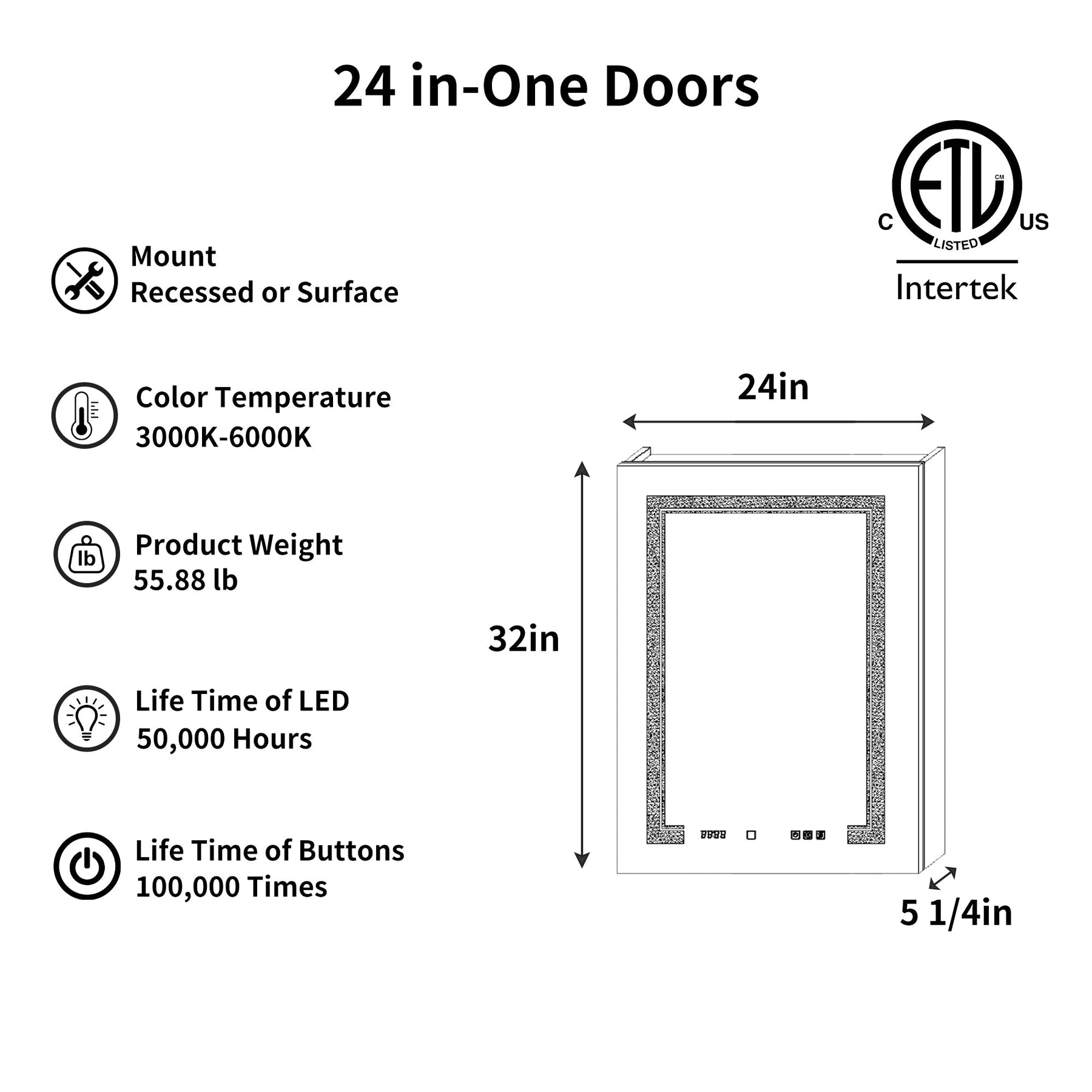 Illuminate your space with the Vilara 24 x 32 LED Medicine Cabinet, featuring fog-free technology and a versatile surface or recessed mount. This modern mirrored cabinet offers a soft-close operation, digital clock, and built-in outlets with USB ports, perfect for enhancing any bathroom or personal grooming area.