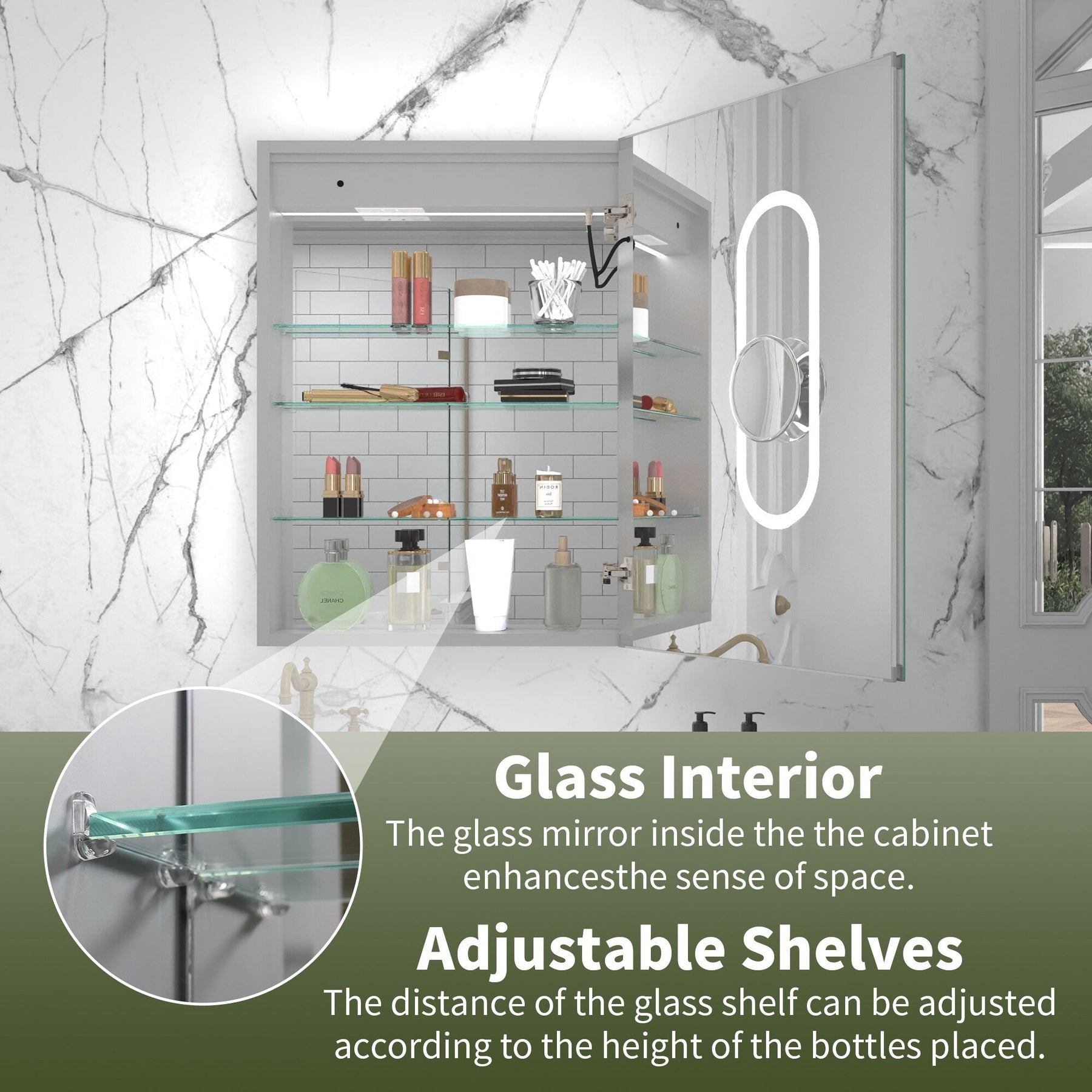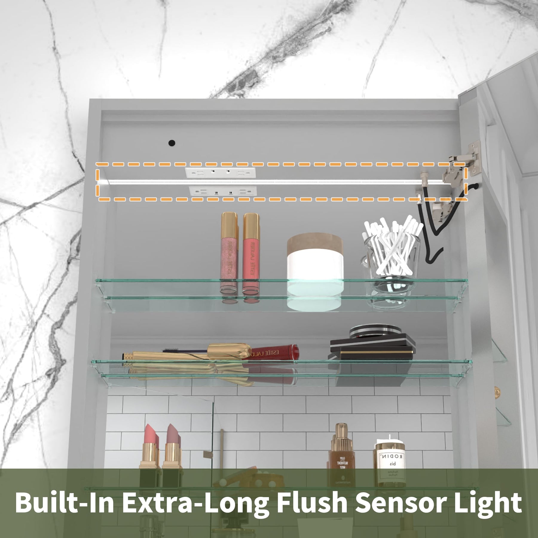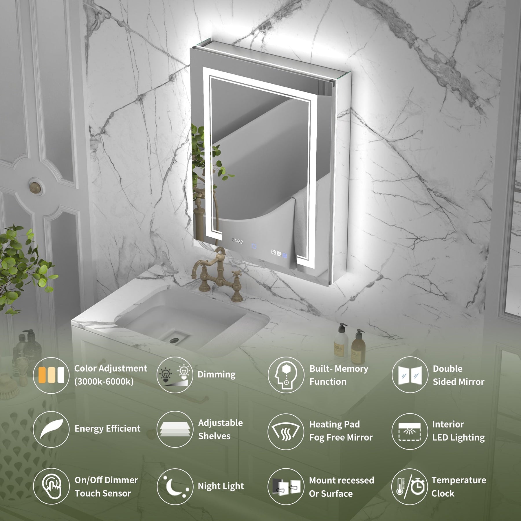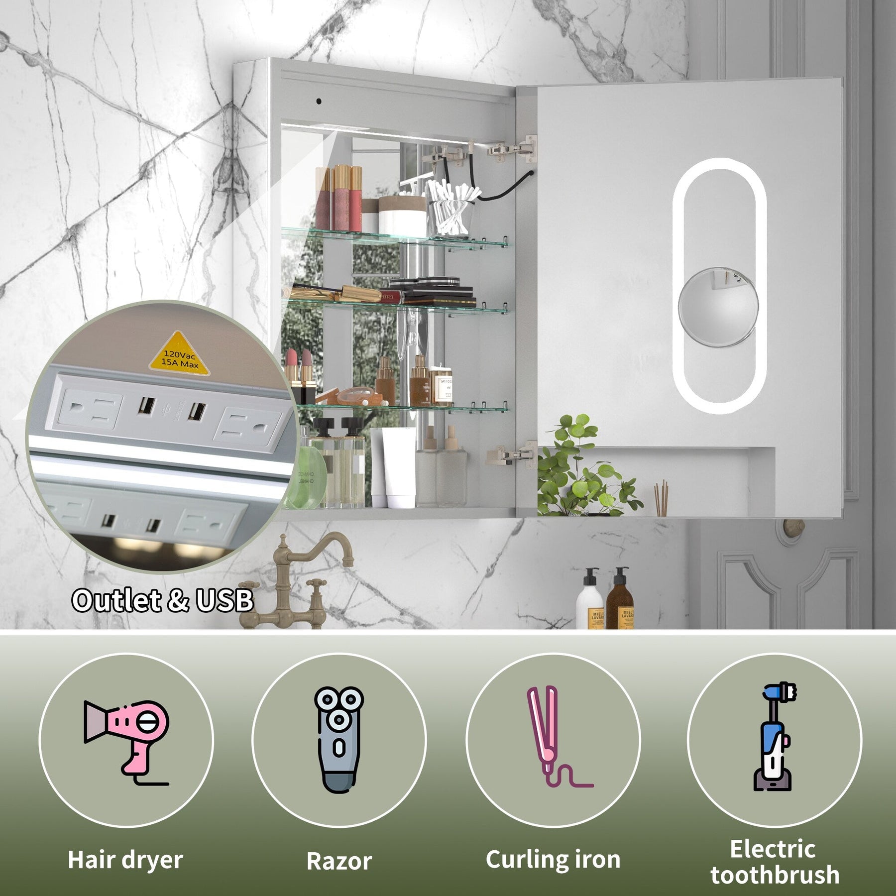 ExBrite Vilara 24-in x 32-in Lighted LED Fog Free Surface/Recessed Mount Silver Mirrored Soft Close Medicine Cabinet with Outlet