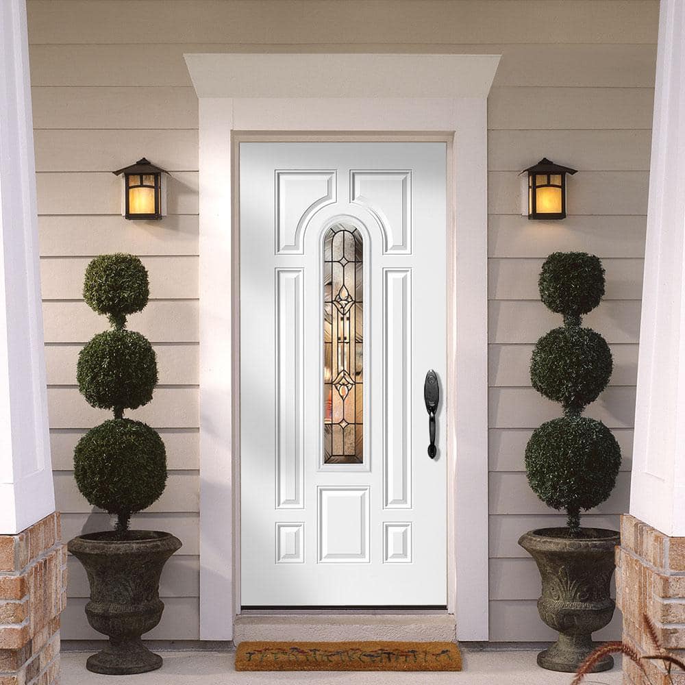 Enjoy the strength of steel and the elegance of decorative, center-arch glass with this primed white Masonite Providence prehung exterior door. Built with triple-pane insulated glass and wood frame with brickmold, it arrives ready to install and paint for a secure, stylish entry.